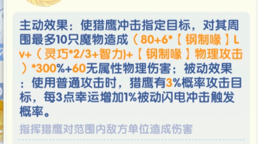 首先说一下鸟猎的伤害构成:用普攻触发闪电冲击来输出如下图: 所以对鸟猎来说攻速>敏捷>幸运(后期满攻速是必须的) 还有一个祈愿里的头饰,普攻触发加速术很香。没有的话就加幸运敏捷的饰品为主。其他地方敏捷药水,鲜虾汁,道具商店里的集中药水都可以加攻速(还有牧师的buff)。 属性加点,前期没有很多,主敏捷副幸运(3的倍数)实测吃完所以道具➕牧师buff攻速240%以上攻速有肉眼的提升 技能加点:训鹰术