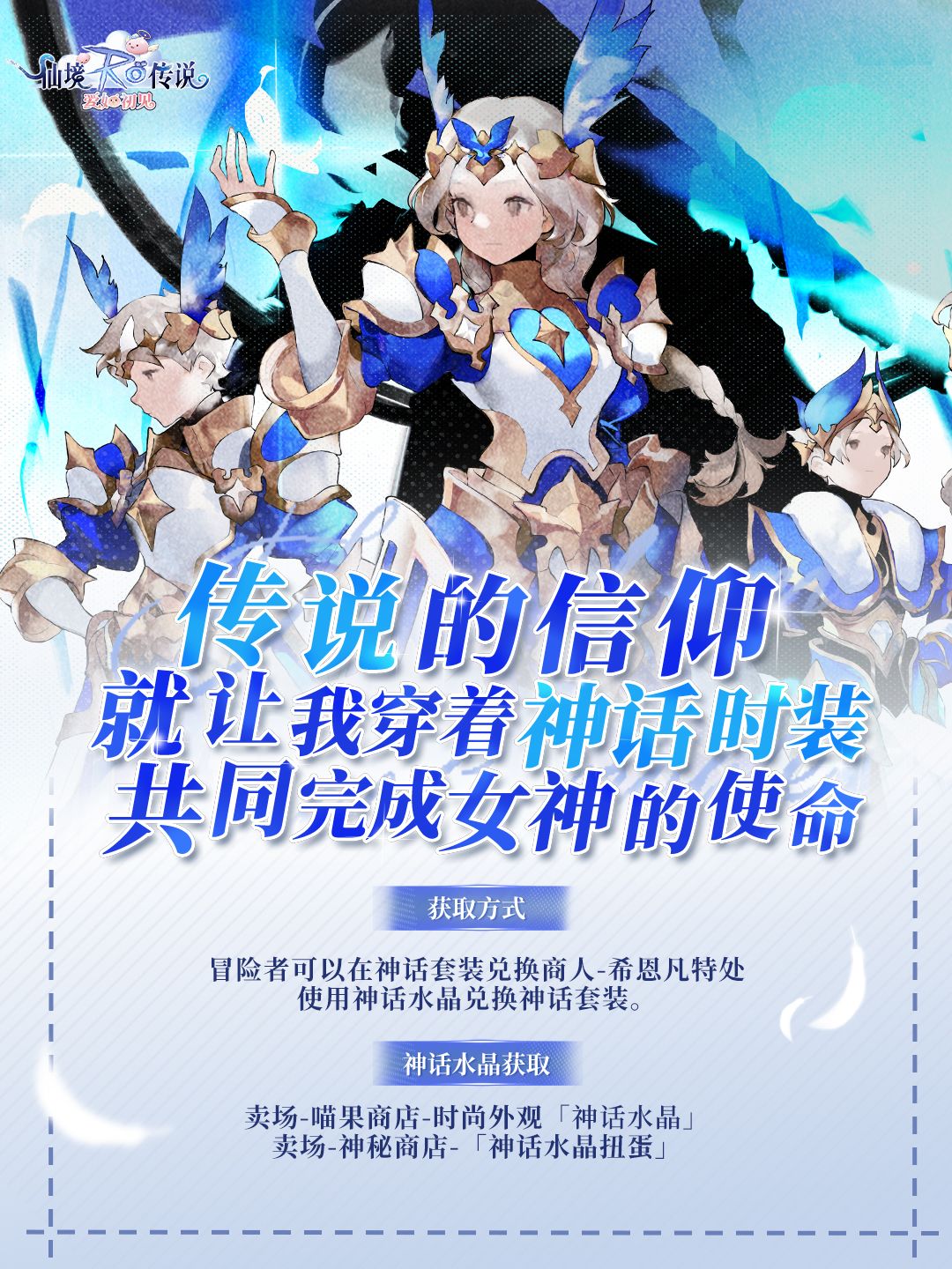全新神话套装【诗嘉古尔的庇佑】&【亚尔薇特的祝福】已经登场! 🌟诗嘉古尔的庇佑 超经典骑士装配色!将天空和海洋的颜色凝在战袍上,白金蓝的配色颇显贵族气质。炫目的星光镶嵌在盔甲,幻色翅膀充满魔法的力量。以女武神的灵魂,一同前往神圣的城堡,来一场轰轰烈烈的胜利吧! 🌟亚尔薇特的祝福 在被白雪覆盖的神话世界里,勇士们银白色的盔甲闪着几分寒芒,巨大的翅膀映上几分天空的蔚蓝,钻石般闪闪发光。无垠的天空下,众