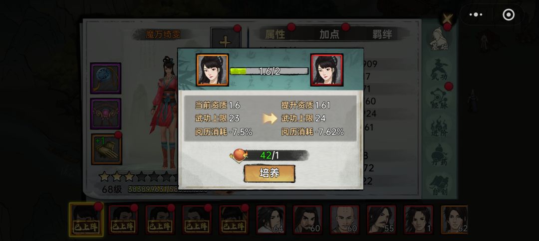 本人浪费了600多块钱,总算总结出了一点东西。首先这是一个极度肝的游戏。肝比氪金重要,比肝还重要的更重要的是游戏思路,这个游戏没有任何给你试错的机会。什么武功倒是其次,因为武功都是可以往上合成的,最终都能合成红色。所以主要目的就是通过提升速度加装备群攻来提升打怪效率。 1.开局只能是两个人物,一是夜渊,一个是郭云天。(张益禾的那个速度羁绊人物不知道是谁,知道的话也行) ①平民就是夜渊开局,升被动加