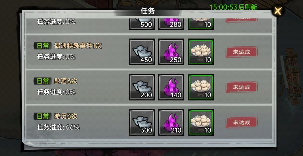这期科普任务相关: 游戏界面左下角的“任务” 第一个主线任务:无脑推图,每第一次100%过一个新图都有相应的奖励,除开第一次100%完成,后面刷全图不再有奖励。(我通关辽东过后就没有主线任务了,可能是主线任务通关辽东就是毕业) 第二个循环任务:完成这一栏下面的全部日常任务这个也就跟着完成了,完成后送天书1和侠客令牌2(每日必完成) 通常日常任务一共六个,分别有以下9项选6: 1.强化装备,锻造室处