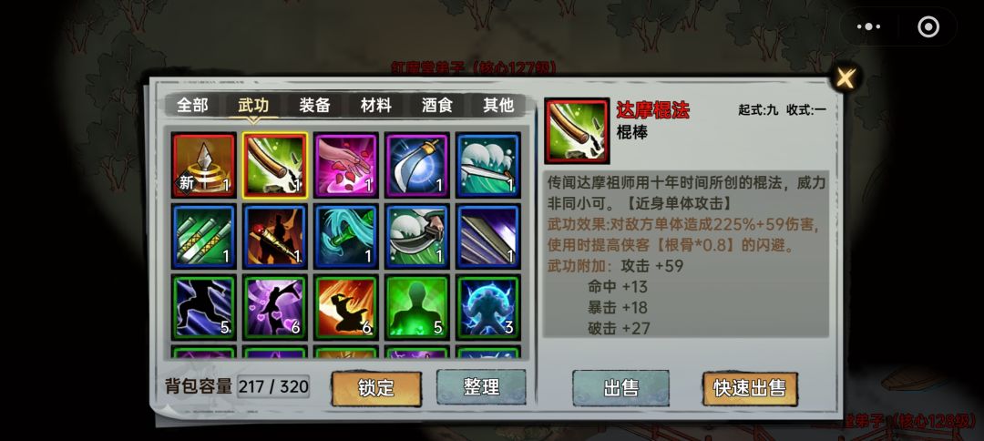 游戏开局:会有四种外功选择,对应刀、拳、剑、棍;外功决定使用武器和武学 ,更换外功只影响绝技释放。 外功最多提供攻击、命中、暴击、破击四种属性,内功最多提供气血、格挡、狂暴、抗暴四种属性, 轻功最多提供防御、速度、闪避、破击四种属性。 所有外功、内功、轻功提供的属性都会叠加,所以只要技能栏有多的位置,把能学的高级功法全部学上, 只有面板数据高了,才能打出可观的伤害。 关于加点:刀法优先臂力,拳法优