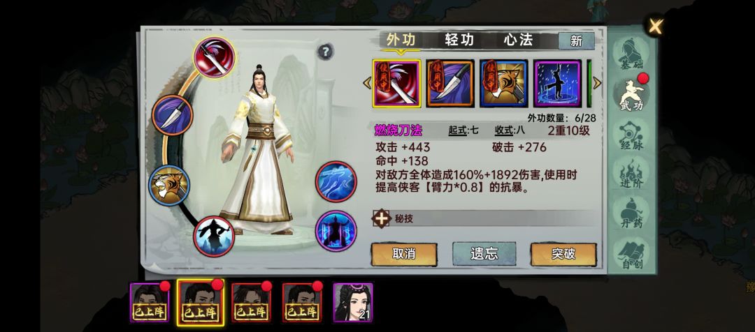 炼丹:有陌路丹药 回血 提升攻击 格挡 闪避 遇到难度大的图时可以使用 材料刷图有掉落 藏书阁:5级开始每日22点刷新免费1次 凑够10本天书可以十连抽(元宝3888) 会客厅:招募侠客,每天可以银两购买白绿蓝给主力侠客升星到4星 4星以后需要喂紫侠客才能继续升,平民到4星就可以了。 锻造室:强化装备 高级装备需要用玲珑石进阶锻造室 卧室: 书桌秘技:30级开放每日可免费抽一次。十连抽可以获取红色