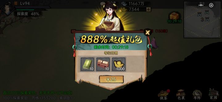 证明不是托😡只买25块等级礼包,10本书10个经验盒子加1000元宝,还可以吧!648的基金就算了,太贵没必要,慢慢玩吧!每天广告和宝箱赚元宝,必做!再就是做做日常任务。这就是个佛系养老游戏,别充太多钱,没必要!目前这个号充了2000+