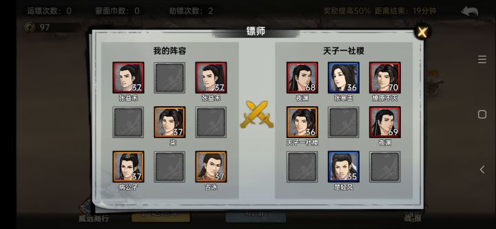 因为昨晚上押镖被人从头劫到尾,所以今晚也准备劫一个结果,这样的队伍叫人触目惊心啊!不知道官方是怎么看待这些严重超载问题的。截了图,然后就找了个主角橙色四个随从都紫色的37级小朋友去搞第一次的亲密接触,结果就是我38级三红两橙(俩张一香一病带主角)被直接秒了?!我还没看清呢,都还没动手,对面已经把我全剧终了,震惊得都忘记截图了,只好发超载镖车图。顺便问一句,这游戏开了挂用了脚本没有后