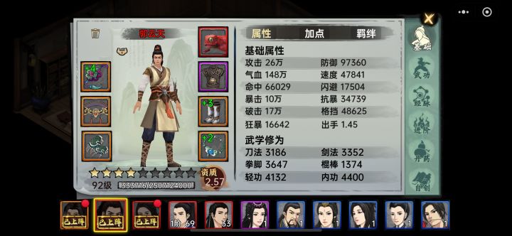 本人浪费了600多块钱,总算总结出了一点东西。首先这是一个极度肝的游戏。肝比氪金重要,比肝还重要的更重要的是游戏思路,这个游戏没有任何给你试错的机会。什么武功倒是其次,因为武功都是可以往上合成的,最终都能合成红色。所以主要目的就是通过提升速度加装备群攻来提升打怪效率。1.开局只能是两个人物,一是夜渊,一个是郭云天。(张益禾的那个速度羁绊人物不知道是谁,知道的话也行)①平民就是夜渊开局,升被动加