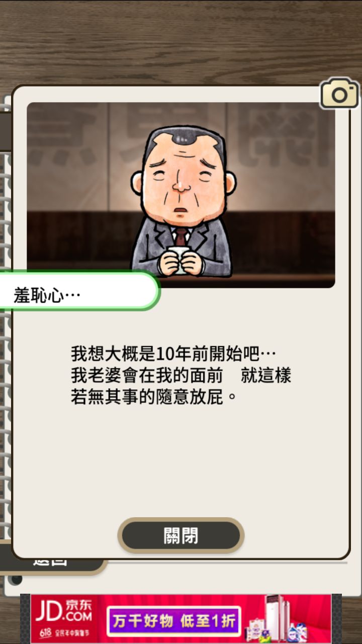 两天通关,撒花撒花!下这个游戏之前还以为是个单纯的治愈游戏,但是当谜之上班族出现后,一切都不一样了。放一些人物图片和结局。一、单人组1.夜店小恶魔2.上进青年二、二人组~1.课长和新进社员互相不满的两个人之后喝了个爽2.女强人太太和大妈只有你才配做我的对手!三、关系复杂七人组~1.青年和女孩是男女朋友准备求婚啦2.老爹和女孩是父女关系3.谜之上班族想杀掉女孩其实女孩