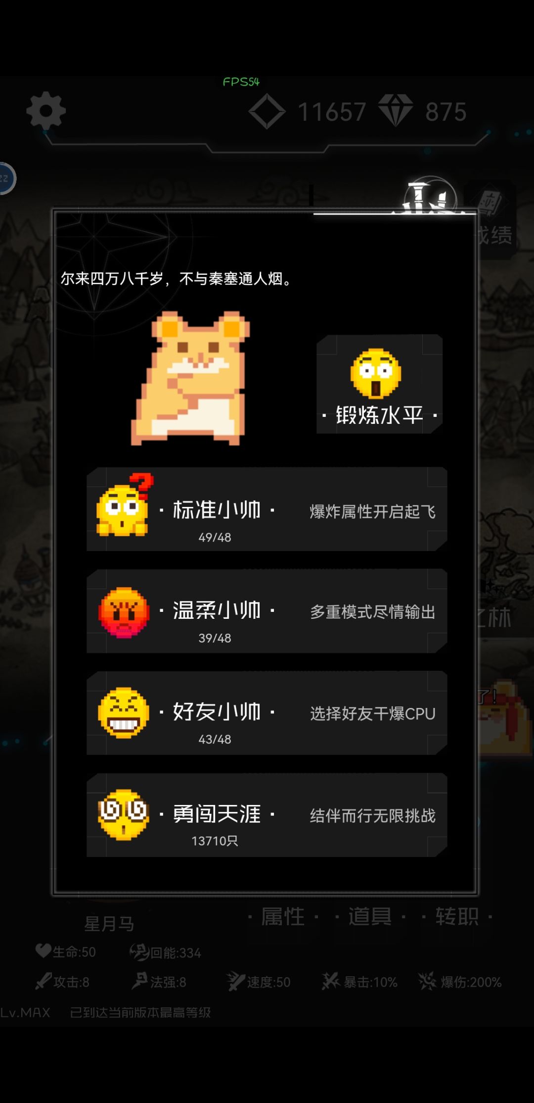 小帅模式。标准小帅。就说48吧。老虎。全点能量。选每秒血量。初始机械核心。多攒几个后用道具劝降。后续受攻击加收益比较高。加暴击和能量就差不多了。 好友小帅。鸡+熊猫。全点能量。选召唤血量。初始就选血量加攻。其他就随意了。 温柔小帅。大部分老浅打的。全点能量。击杀加血量,扛不住就选每次攻击加血量。 普通模式。所有的火力选兔子。全点法强。初始选圣光护体。后面找激战,医疗术,等同效应。不选带血量的技能。