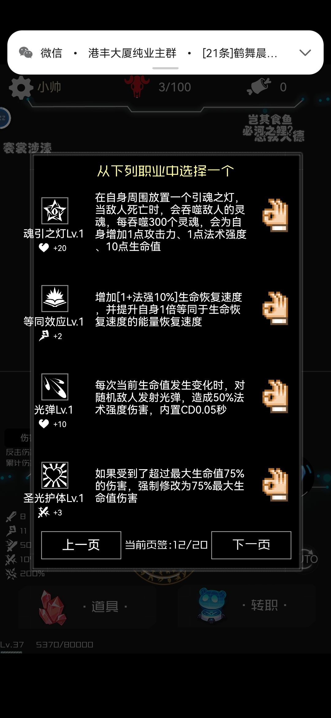 1、选猫头鹰和老浅,老浅提供易伤,600万能量上限的猫头鹰打输出 2、开局选任意伤害加攻击,度过前期,后面拿加攻速、加能量上限、加攻击法强。不需要回蓝,不需要大肉块,生命值可有可无 3、第一个技能选激战,普攻回血。一定要拿到的技能有圣光、加弹道、企鹅小美、企鹅骑士、骷髅骑士(增加召唤加属性的选择,百万攻速,一秒召唤几十个骷髅) 4、为了能拿到想要的技能,不要急着把技能学到3级,因为学满了后面就没有