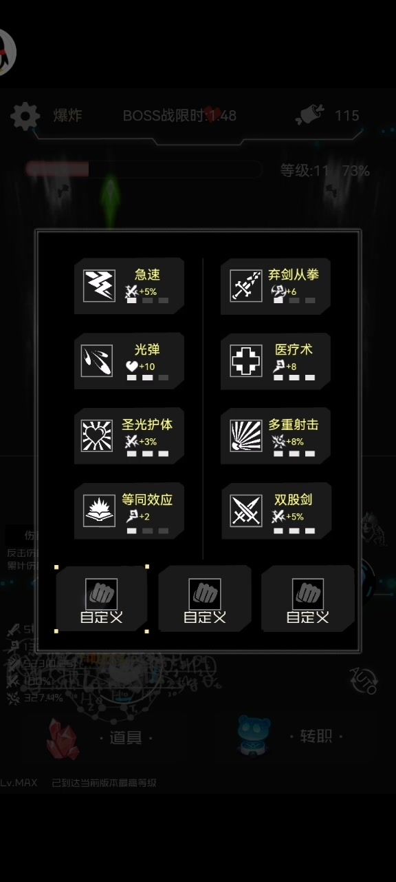 人物选猴子,自选召唤加攻击!第二关最好是学技能加充能,后面选爆伤就行 技能优先能量冲击,神经博士,圣光护体和激战 30关左右可以看情况最后boss用道具十万火急 这套除了颠簸外都能用,30关前颠簸可以用 老浅自选受伤加攻,技能还是冲击,圣光,激战。 30关后忘了,卡在39一天了,前面忘光了[表情_困]