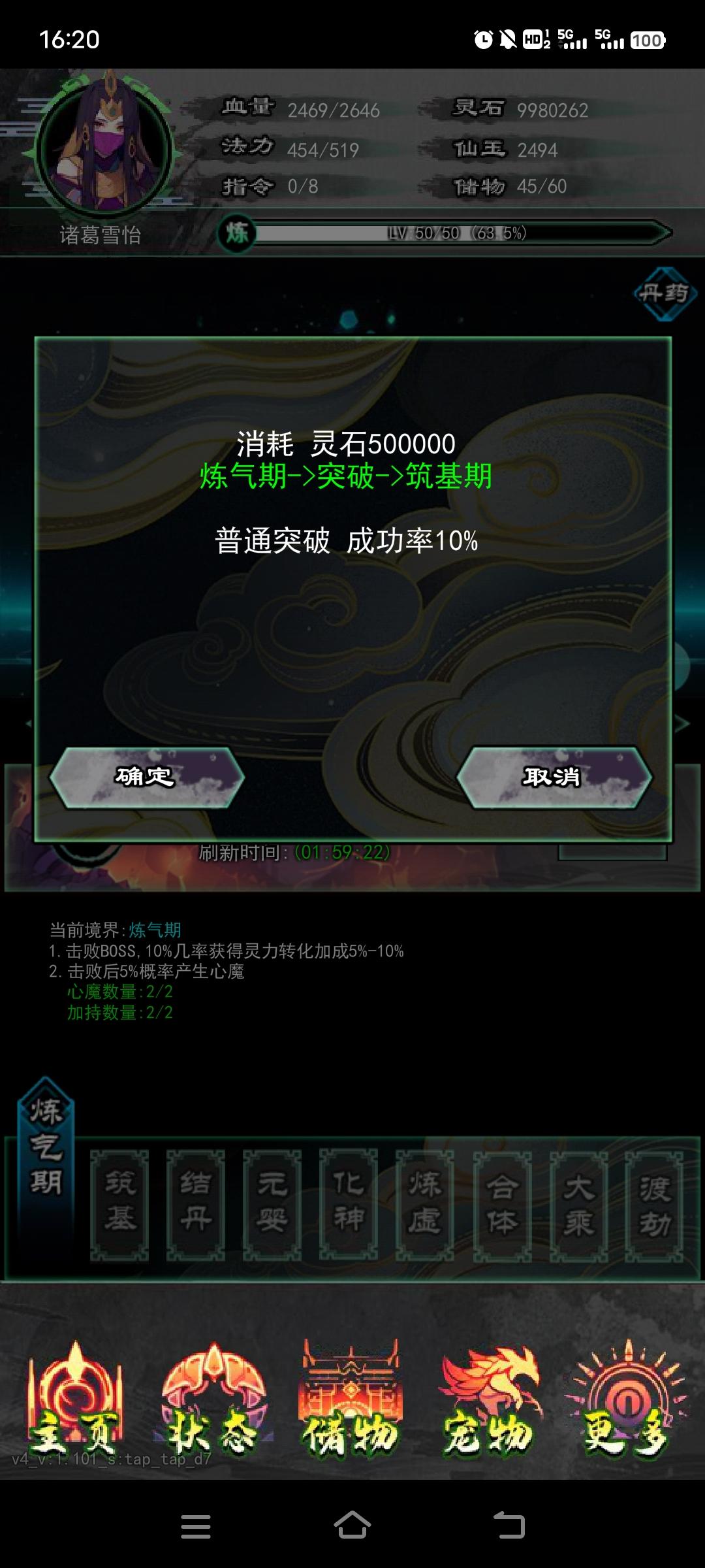 今天50级了,开始突破了,目前买丹100%渡劫成功是要花1000万金币买丹,强制突破概率10%,消耗50万灵石,金币目前还是很缺的,前期不能乱花