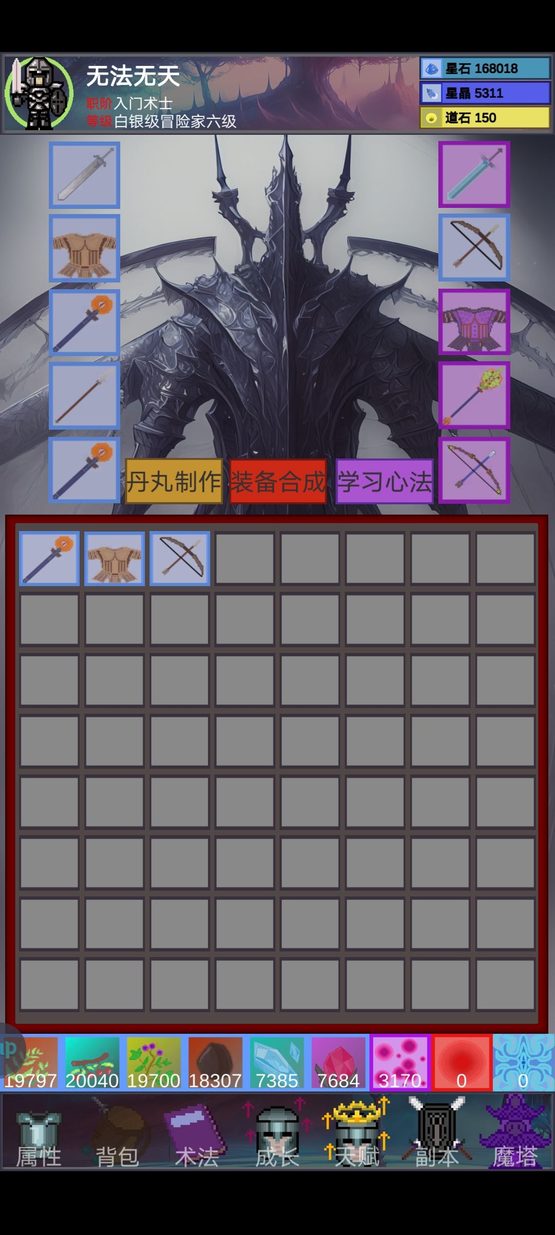新手上限第一件事就是签到,签到送书+50道石(道石是游戏后期得重要资源,用于制作,强化装备)第一天签到还会送2把弓将就用着吧, 副本打通100/100 ,会开启boss和扫荡。boss只能打一次,有概率会爆出装备。打通boss就能扫荡。 现版本技能流最强,装备方面,新手前期资源有限,建议优先做出10紫法杖(特效增加技能伤害) 术法,1阶术法可以理解成加基础属性,2阶术法是技能。秒图最强的术法为暗影