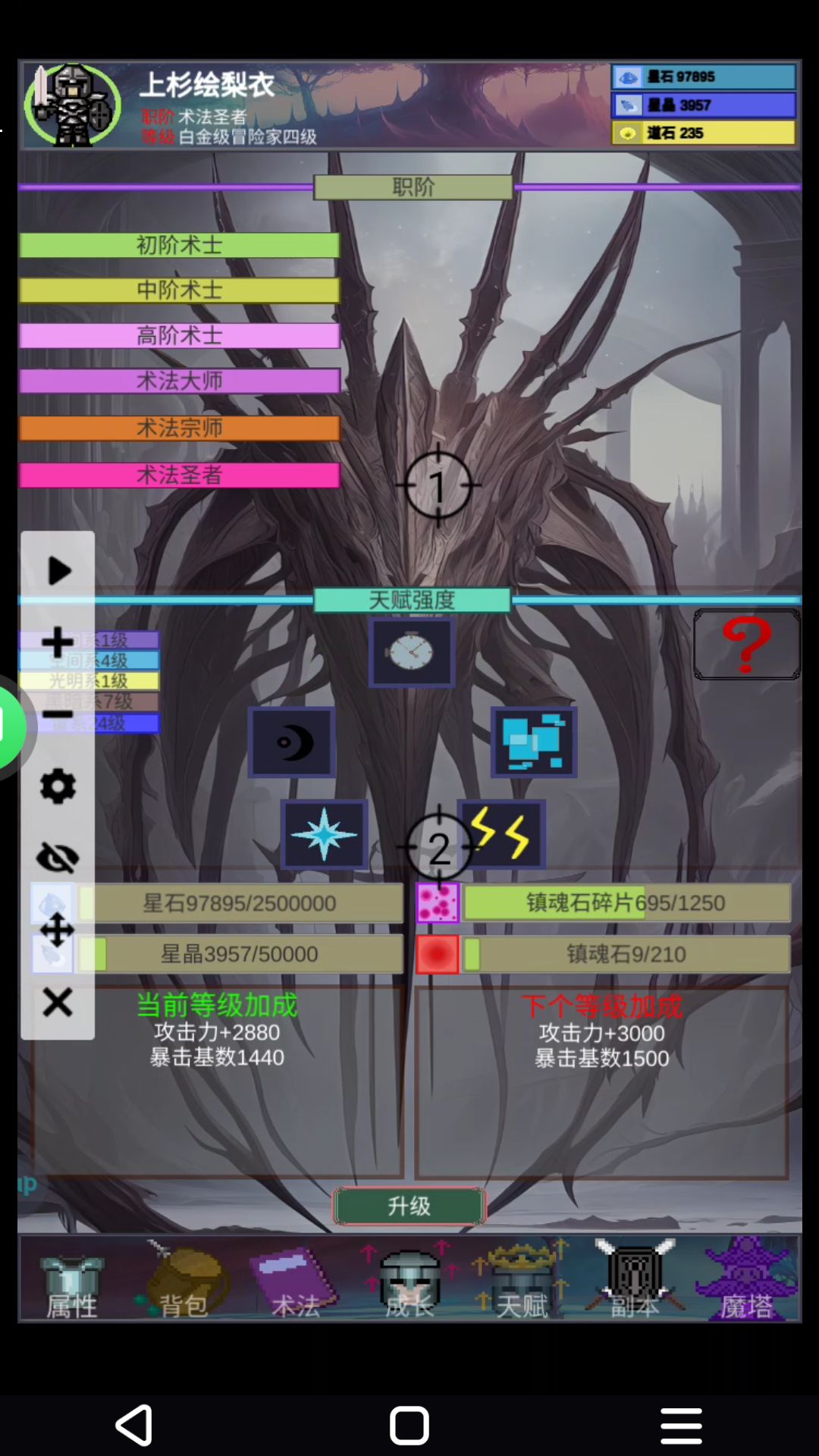 天赋的话,点与不点最大取决于你的挂机方式,在线挂机那么天赋必不可少(中期会却炼丹材料),天赋给的数属性也是相当可观,但是注意!天赋奇数等级给的属性很弱要偶数等级才是大提升,4级一个职介,升阶可以加幸运(最高320)加掉落率 如果你是离线挂机,那么天赋对不与术法的优先级就小了许多,先生术法可以更好的开图,每一个图收益差都是很大的,越后面的图收益越大。 最后给在线挂机的兄弟们说下,一定要学暗影,学