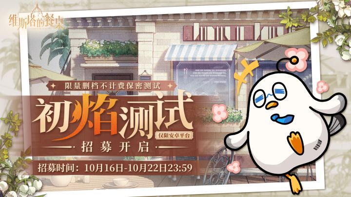◆◆◆《维斯塔的餐桌》◆◆◆--- 测试招募现已开启!---✨《维斯塔的餐桌》「初焰测试」招募开启✨「如同初次燃起的焰火,划破难明的长夜——」《维斯塔的餐桌》将于2023年11月7日开启首次线上限量删档不计费保密测试——「初焰测试」。*本次测试仅限安卓平台。✦测试说明✦测试平台:线上限量删档不计费保密测试测试平台:安卓测试时间:2023年11月7日12:00至11月9日12:00