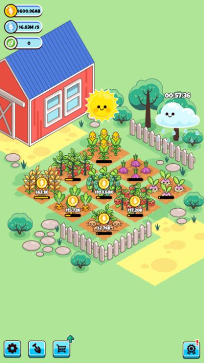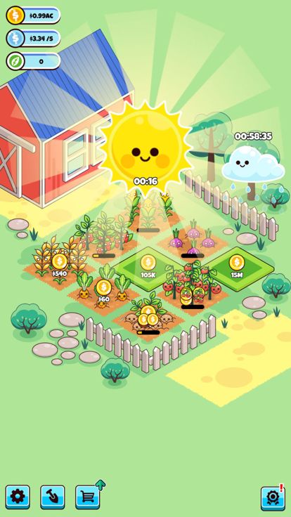 通过种菜生成金币成为富豪大亨。只要购买新的地块,种植农作物,收割并出售即可获利。升级作物以提高生产力。解锁新的地块,每个地块都有独特的作物。让我们一起来玩这个游戏吧!
