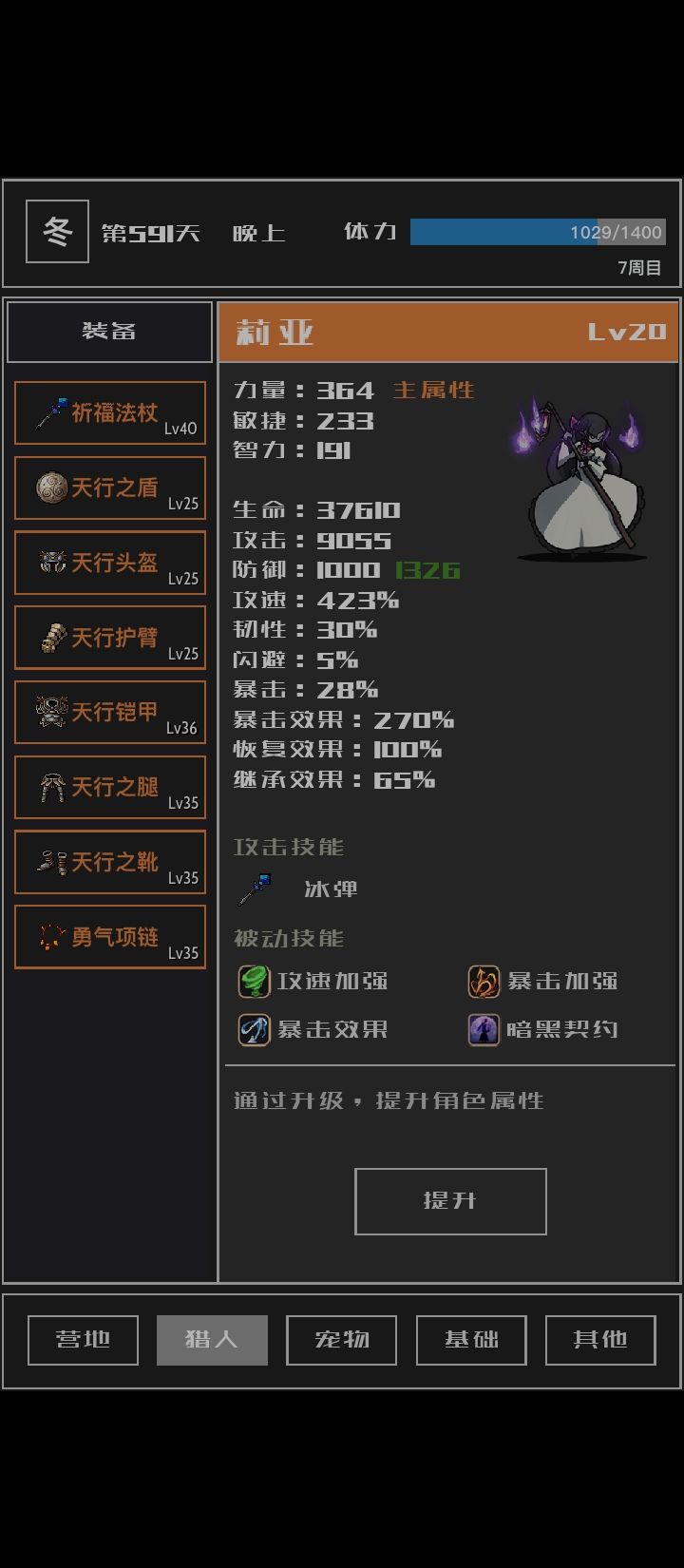 --版本介绍1.29萌新速通8周目做日常,老鸟砸项链凹无限层数。力智都行,敏还是差点意思。--开始前的科普攻速上限500%,防御上限1000(70%减伤),韧性免疫控制,回避上限60%。面板上除了最后三个效果其他都能继承包括三维。猎人主属性可自定义,尽量堆主属性,收益大。--1周目尼尔,5力量,装备敏捷之刃,风铠,其他任意紫。带蜗牛(6图)和枯木(1图秋)即可,其他宠物建议火灵珠(5图