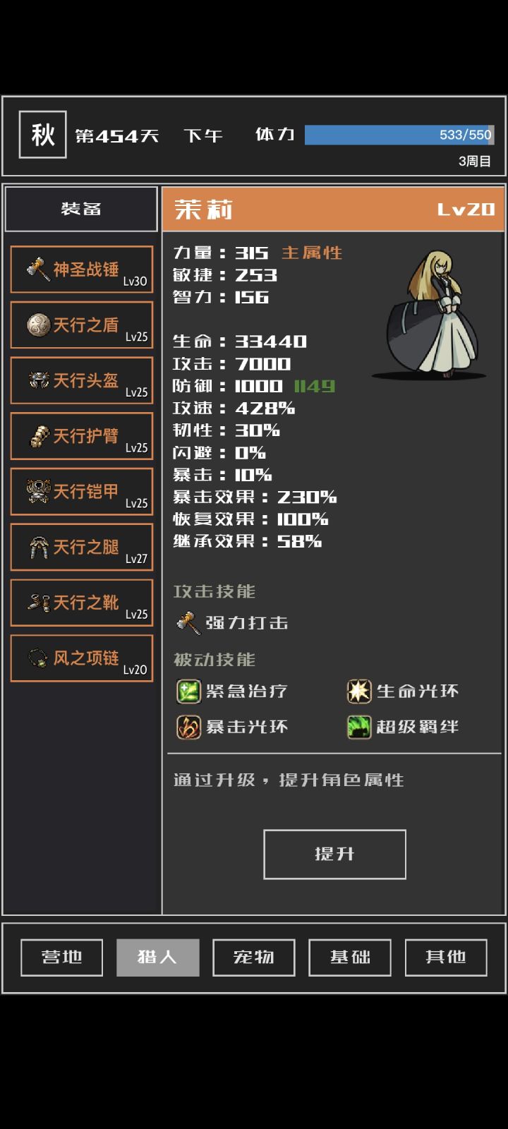 刷就完事,不过猎人有强化宠物属性的技能,我的装备都往那里凑,活下来才是关键,毕竟后期敌人有一堆免死和残血爆发。要是装备都强化上去,可能队伍血量能破18000