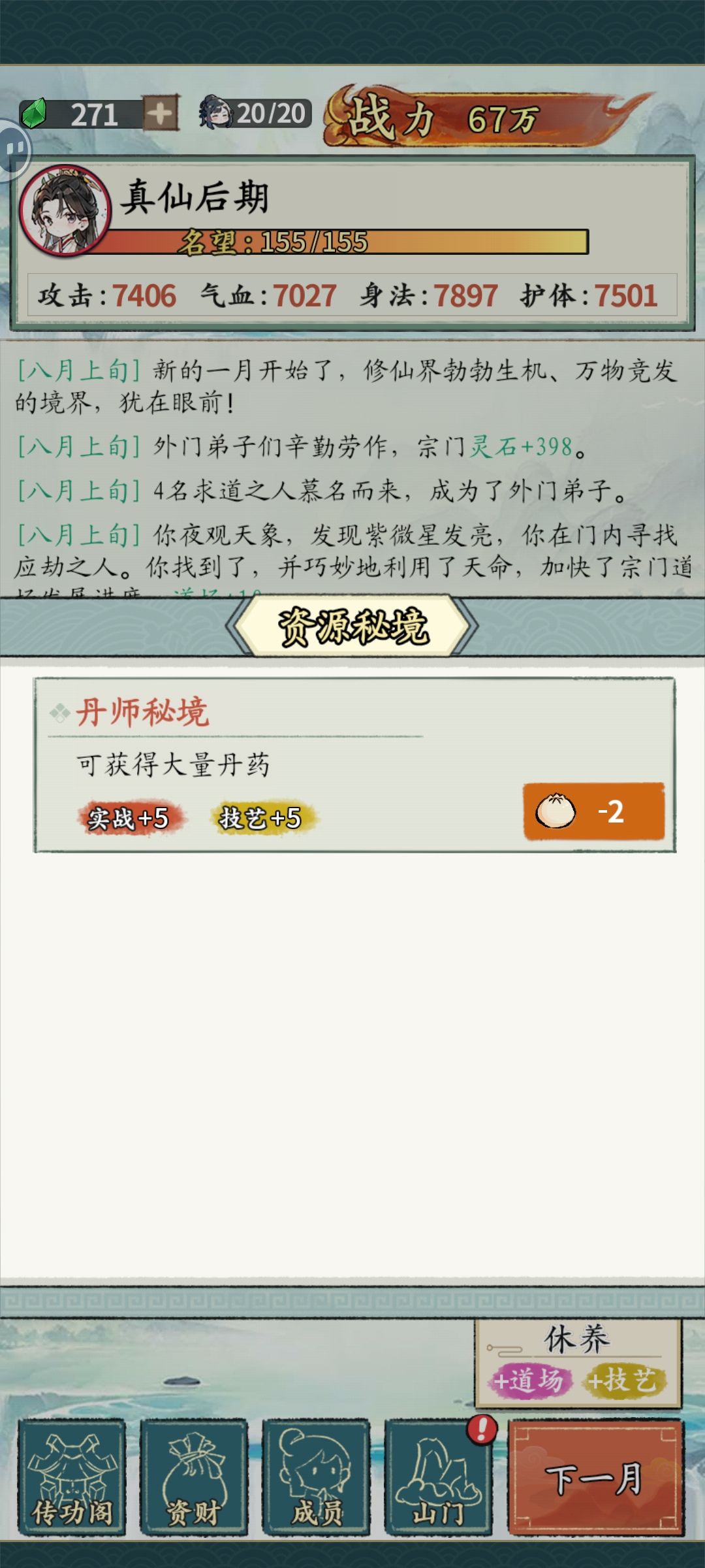 不看广告,也不是那么速通,毕竟点丹药也挺费事。 1.开局 建议是选个橙色人物,前期容易过渡到秘境,蓝色人物比较缺攻击属性。(不太建议天灵根,但也没太大影响) 2.留灵石 开局和事件留着所有灵石,一毛不拔。正常打一到两个危机后会到丹师秘境。 此后顺序为:秘境→危机→宗门大比→危机→秘境 3.买体力药 全部灵石买体力药,然后无脑刷秘境。概率出秘境傀儡战斗,战斗胜利会给名望。(所有战斗胜利均给名望)优先