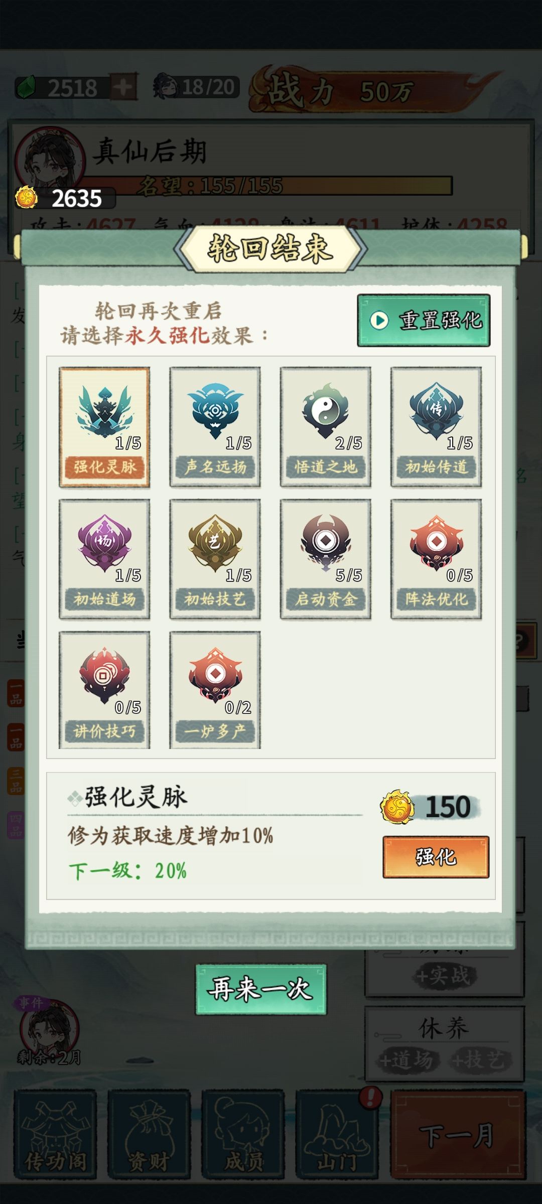天赋点满启动资金,四维点一级就够,有剩余点其他,广告看一次性永久解锁那个。 开局直接启动精力,第一个月加名望到筑基解锁4精力,灵石买阵法,一级气血一级攻击,其他不用买。 第一年多刷名望和道场,第一个秘境刷到元婴中期开5精力3外门,存一点灵石第二年招满弟子。 第二年之后嘎嘎刷功法和秘境,紫色之前功法全部点中间,紫色功法按照先左后右再中,点满紫色左边就别刻意刷功法了。 再之后灵石全用来刷秘境,基本不缺