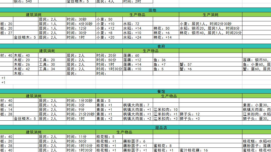 小麦2分30秒 木材2分30秒 素面4分 木板5分 肉5分 水稻8分 肉面8分 扣肉15分 桂花15分 棉花20分 工具20分 桂花糕20分 棉布20分 棉毯20分 鸡蛋25分 莲藕30分 藕粉丸子30分 狮子头30分 由于游戏里的人数是有限的,大家有30分钟以上休息时间的时候,可以尽量安排时间长的。 其中,餐馆和养殖场可以安排三个,也就是三个养殖场可以安排九个鸡蛋,平均每个养殖场一小时15分钟。