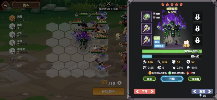 配置挺低的,核心都才2星。 8法很强势的,实际完成阵容是5传奇6法,不过一直不出传奇剑圣,金卡星级也太低可能加成不够高。另外一个强势阵容应该是5刺客3暗影,理论上会更无敌。可惜游戏内容太少,这就通了