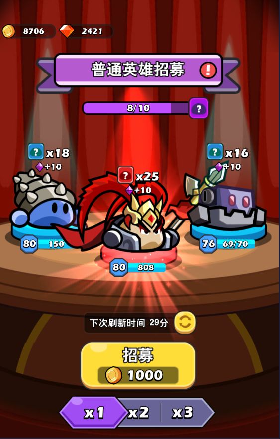 这游戏浅玩一个月,基本该抽的英雄全部抽齐了,目前处于养老阶段。 版本最佳输出小丑,t800,生化人,火拳。(看到了无脑拿,1200也可以拿,萌新别学,优先凑这几个英雄55级) 万金油百搭:伊布、女王(我女王等级太低了没带)、雪兔,必须带上 前期抽卡把所有英雄抽到65停手,然后开始1000金币抽卡,遇金卡抽3000,后期个人感觉可以用1200钻石拿想要的,有时候450钻石就拿下了(运气好)! 最后祝
