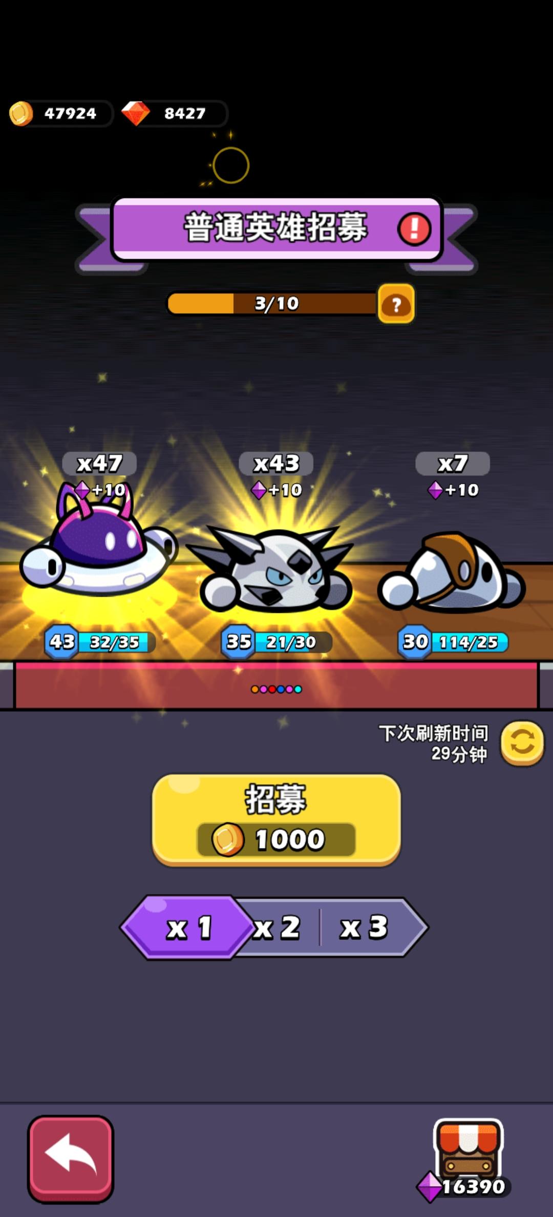 比开服大佬晚三天才开始游戏,所以一直没有时间写攻略,现在来看看这游戏的抽卡机制吧,核心就是靠抽卡来提升 英雄分为白,蓝,紫,金四种品质,品质越高,每次刷出来的碎片数量更多,不过也不好抽到 这游戏抽卡和别的游戏不同的是,每次刷新之后都是三个英雄,三个英雄的品质不确定,白白白到金金金都有可能(我最白出过紫金金),而且不用非要等保底,都是随机,保底也有可能只有白白金然后抽到白 然后第一次抽取的时候,可以