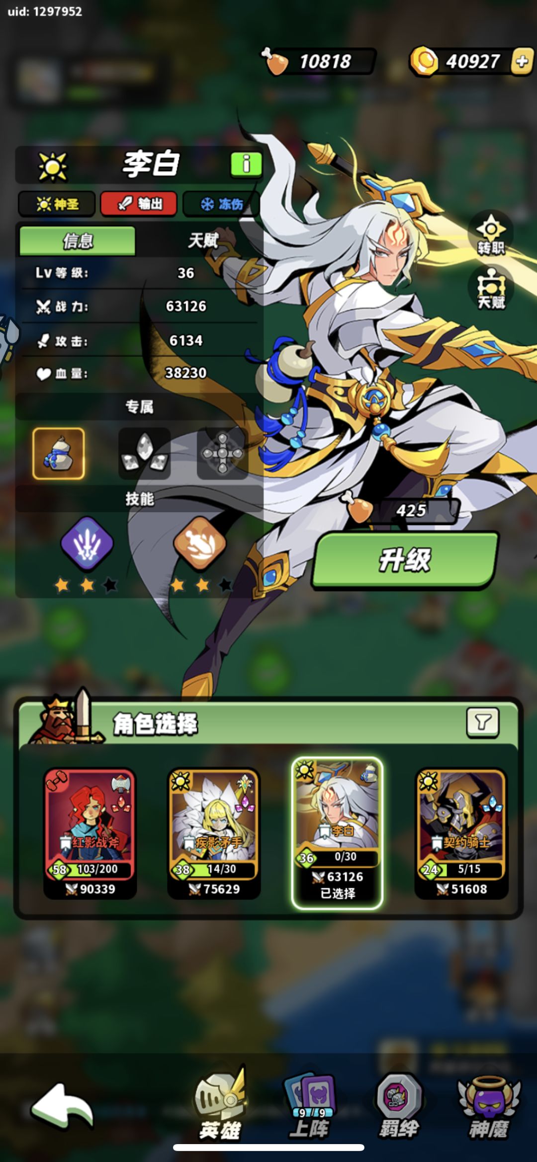 T0 魔剑 无头 女娲 句芒 黑猴 T0. 5 光矛 冰女 兔子 白蛇 许仙 敖广 T1 双刃 魔女 猴子 国王 T2 契约 棺材 吸血鬼 野猪 神灯 魔剑:常驻最强英雄,“ 裁决之刃 ”技能cd很短,释放频率很高(推荐转职) 无头:群体最强英雄,在满级纹章的情况下大招持续时间很长,伤害也很高(推荐转职) 女娲:一技能四种效果随机一种伤害而且伤害挺高,大招也有控制比较适合打辅助,目前没出转职强