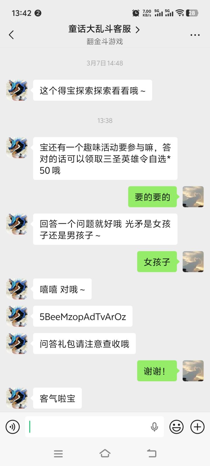 客服真的超赞,还给送了三圣兑换码