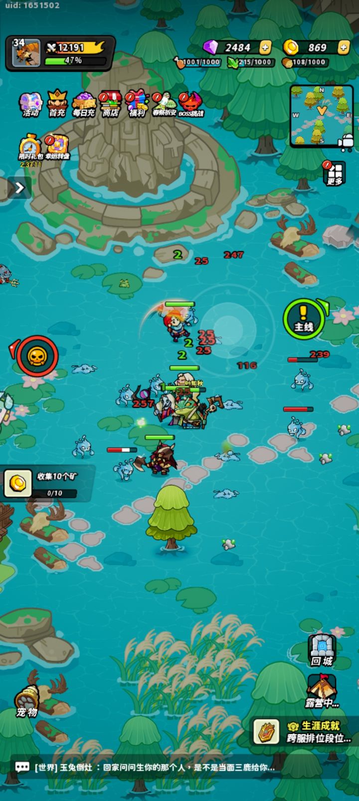 新手快速升级与资源获取 - 开局升级:进入游戏后,找一个人多的地方挂机,共享经验,升级速度极快。 - 资源采集:前期肉和矿石是关键。肉可以通过挂机打怪获取,矿石推荐去村庄的8矿地点刷取。 - 露营机制:露营能吸引更大范围的怪物,提升挂机效率。每天有1小时免费时间,开启特权可获得双倍收益和时间。 ### 阵容搭配建议 - 前期核心:前期阵容以“奶”为主,保证续航。推荐使用 神愈圣王、治愈乐章、嗜血灵