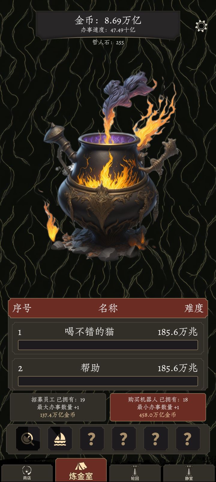 轮回会把之前的哲人石全部清除,然后给你几个,呐,我特地尝试一石轮回,然后以前的都没了,这是真轮回啊,啥也不剩那种。所以这成了个一次性的游戏,没有累计加强,这次你买不起后面的,这辈子你也买不起后面的了