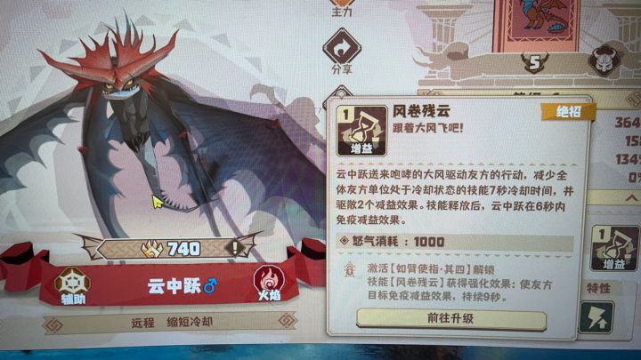 今天玩到第八天,新手保护期刚过,首先吐槽一点,重置,不免费就算了,能不能学学其他同行,花50/100钻无损重置也行,强制扣20%是什么东西!!说回云中跃,首先定位是辅助-技能效果缩短技能CD,驱散最高攻击队友的减益,并为该队友加怒气加攻击加免疫状态,妥妥的辅助T0;获取方式就是98元战令,需要耗费时间做日常任务升级战令;缺点费时间,优点稳定获取;当前情况下,最佳搭配满星烈焰,记住是满星烈焰,