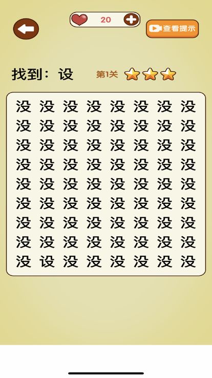 这款游戏将帮助你更深入的了解汉字,在众多汉字中找出与众不同的那个字,需要考验玩家的眼力,每关会有三次选择的机会,找到不同的汉字即可过关,快来试试看吧。