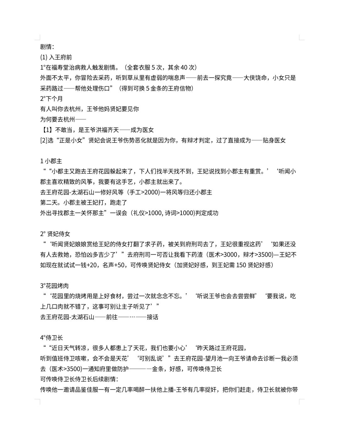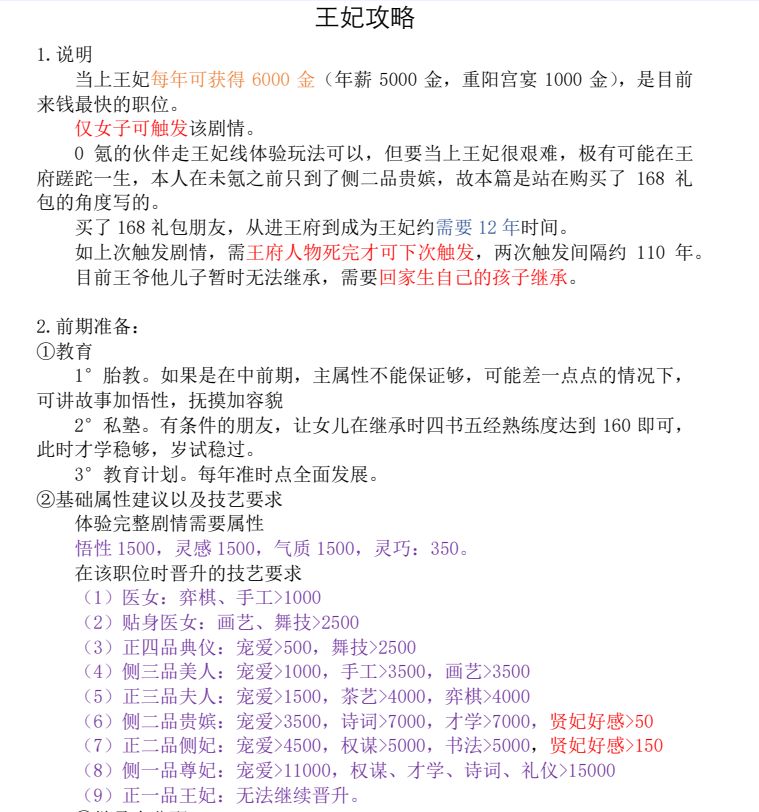一,说明,本攻略只写正确的选项,其他奇奇怪怪的剧情太多,这里不一一赘述 当上王妃每年可获得11000金(工资+重阳)仅女儿当家主可触发该玩法(没有衣服宠爱获取比较难,建议商城至少买件30的衣服)(3件衣服齐全为40倍好感) 二,前期准备与属性要求 (1)完整体验需悟性,灵感,气质各1500(门槛)以上,当然越高越越好,属性刚到门槛或者差一点点可通过胎教讲故事加悟性,或者多生几个养蛊的方法达到要