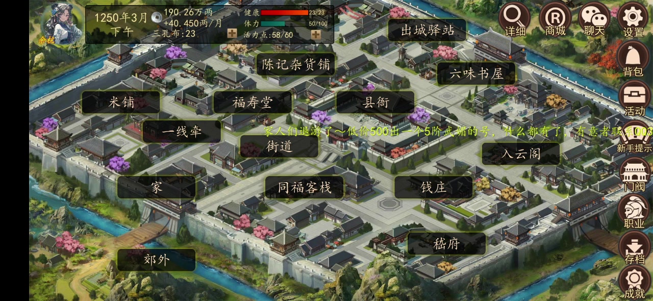开局指引选衙役(医师要悟性40,家丁要长得好看,武艺要2oo以上)要捐5两银子。郊外遇到白蛇选一起吃(救蛇,获得白娘子,但要打以下法海)用开局给的两百银两,分别购买陈记杂货店里的所有东西和六味书屋一百两入学。购买(四书:大学,论语,中庸,孟子)(五经:诗经,尚书,礼记,周易,春秋)还有笔墨纸砚在详细里装备好,还有一百根蜡烛。三月,开启去六味书屋里上课,夜晚去县衙上班,深夜里看书。把四书分