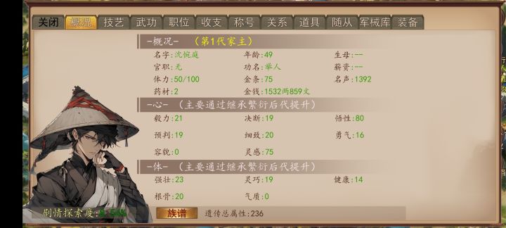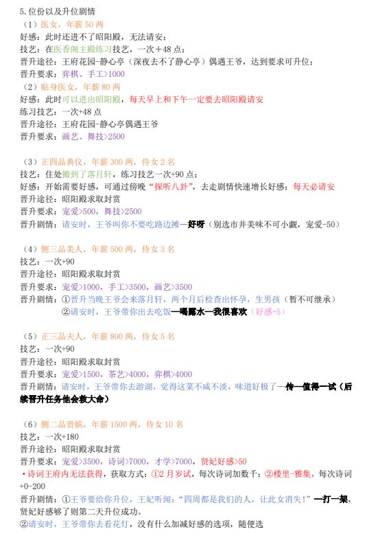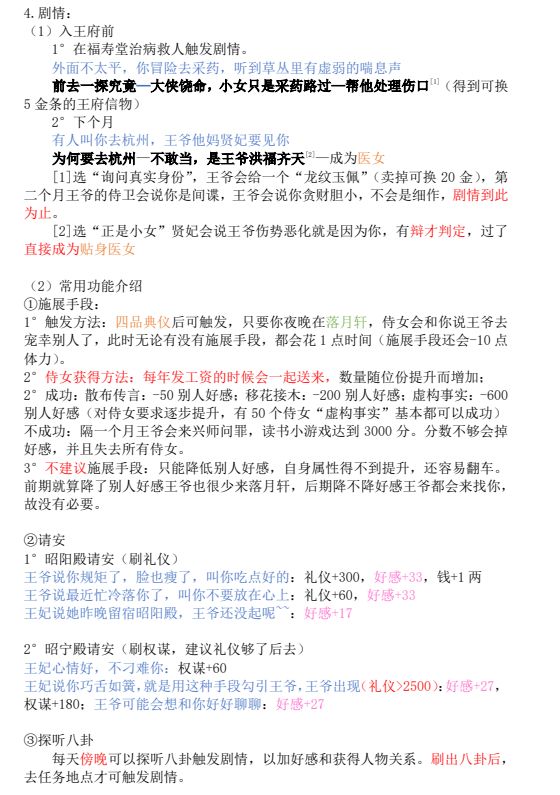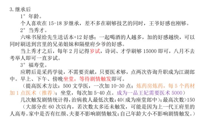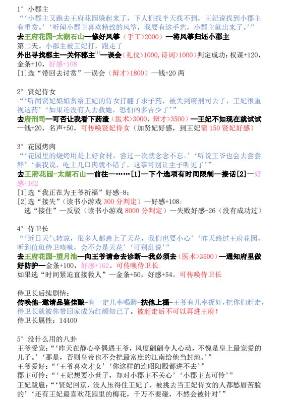 蛇的剧情(需要属性辩才100,武艺2000,才学500,白蛇好感度80,次要勇气100,悟性100)遇见猎人抓到蛇,劝他不吃,蛇回头看然后走掉冒着大雨你遇到一户人家进去,想太多,自我介绍,蛇会和你说做三年夫妻遇见道人,道长救我,怕不是个妖道,把宝贝抢过来(神符),交于娘子,且慢,死罪可免,活罪难逃(台子)。(得到神器两件 道符和台子)端午节,辩才够100(辩才通过交流中贬低加,和书院师弟剧情的情况不明加)选白蛇恰酒,勉强恰酒,然后勇气(100)够才可以选新花样,思考(这里需要500才学)跟东方朔讲笑话(辩才100),(可得到神器,惊神弓)(辩才可以通过贬低别人加 也可以跟隔壁家小姐夜探选择加)蛇送东西财富and名声and宝物财富20金条,名声不重要,宝物是爱好 法海找你路线一 第一条随便 第二条不去 第三条武艺够选娘子恩重,选妖怪善良开打 法海找你路线二 第一条随便选 第二条不去 第三条除了娘子恩重的另外两条,第四条选低头认错 娘子来找用三大神器(得用三大神器,打出完美结局) 法海找你路线三 ,第一条随便,第二条去,不开打(没法海,要求100悟性)之后就很简单了,习武加武艺,和白蛇造娃,提升快班,培养武艺 赚钱思路 打野怪 派快班巡查郊外,一只大盗最多30金选往死里打,其次是10金和1金(急需要钱的可以sl刷30金,但10金见好就收也不错) 一次只能刷一只所以用儿子查 其他的你需要体力就查街道,需要更多的钱就查杂货(武艺加闪避,以及巡查得到的钱)武艺够好可以一开始选择帮山贼打镖师,几次之后出发殿后剧情加入山寨。然后官道替天行道抢劫路人发横财。但是因为有些难度建议三代之后。(挣钱效率不亚于贪官) 武线儿子养成:胎教选第二个,现在传功削弱,但可以通过传功来加强壮,也就是你本身武艺越高,你的继承人在传功时,偶尔会有强壮+1的加成,如果你是捕快可以通过儿子交互将儿子提为快班,来帮你巡逻(这个连接上面的攒钱思路。 )不是就不可以。 武线老婆推荐:镖局小姐,白蛇,擂台小姐, 镖局线(武线分线):与平安镖局好感到45会邀请参与运镖并且(能捏软柿子),将有一个全新镖局小姐姐出没,拥有邀请后,可以通过和典史交互押镖得到路引。(需要好感值反复要),去杭州平安镖局押镖,一次100两(拿到走镖令,只有白天才能在杭州平安镖局押镖) 绿林好汉(武线主线之一):在郊外帮助绿林好汉(血量两千二左右),就可以触发入伙剧情(第一条应该要选殿后,第二条应该是随便选。),加入黑风寨,最终开始替天行道,(之后会更新反攻县城的路线),替天行道以后,可以在郊外回黑风寨,然后就可以替天行道去官道会给你白银,最高的是官府,其次是镖局,最低的是商队。而小路就能招收小弟,小弟中最好的是红色小弟(应该是有两个)。老婆推荐:镖局小姐,擂台小姐