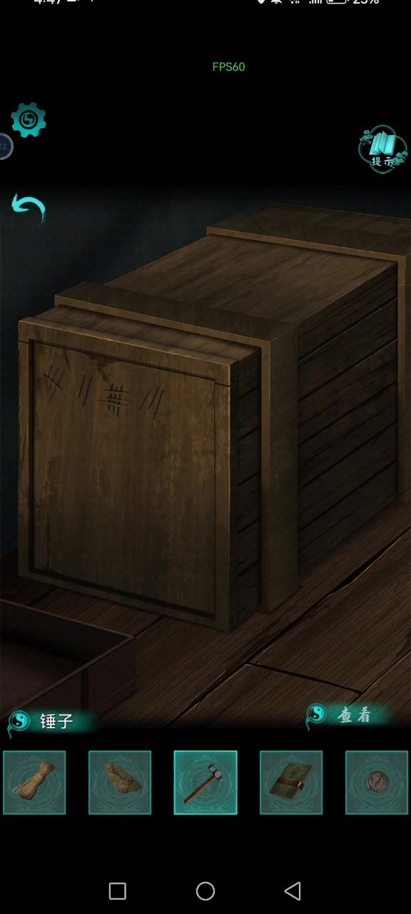 剧情过后直接到门口,现在左边的木桩子上拿到镰刀,查看门右下角,用镰刀乱点就能找到,大概是如下图位置,拿到钥匙后开锁进门到院子,院子里东西比较多,首先看一眼左边的小神龛,提示要米和酒,其他都是暂时无法使用的东西,只有石桌旁边的盒子提示夜岁更年,好像在门外对联看到过。 出门查看一下对联,一夜两岁五更两年,所以获得了密码1252,回到院子调整桌子旁边的盒子密码到1252打开盒子获得剪线钳,对最右侧门使用