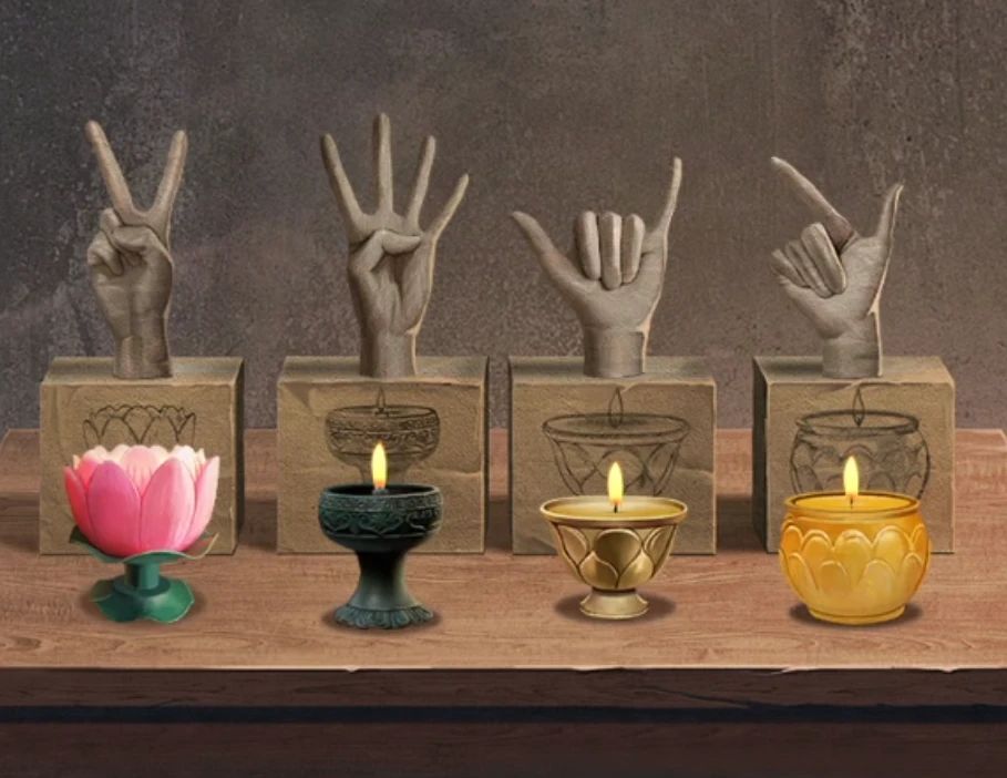 第三章来到祠堂,先拿走右下角的竹竿,其他都线索不足,转身看后面小路场景,查看房子旁边的水缸拿到捕虫网,使用竹竿拿到房门上面挂的丝瓜瓤,对水缸使用丝瓜瓤获得湿的丝瓜瓤,后退一下对左边草丛里的亮点使用捕虫网获得萤火虫,对右边草丛里的脏石碑使用丝瓜瓤获得日期庚戌年癸未月壬辰日,这肯定就是祠堂门口石狮子的日期了。 旁边立着的石碑上面画了一只萤火虫,所以对石碑使用萤火虫,萤火虫爬进去后石碑上有顺序的亮起了几