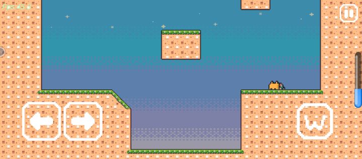 2D像素风画面品质一般,表现效果和FC游戏有几分接近。场景比较单一,基本没什么变化,以及动态效果。角色造型比较可爱,从高空坠落还会趴在地上,很形象。没有教学引导,看按钮UI很好理解基础操作,上手不难。