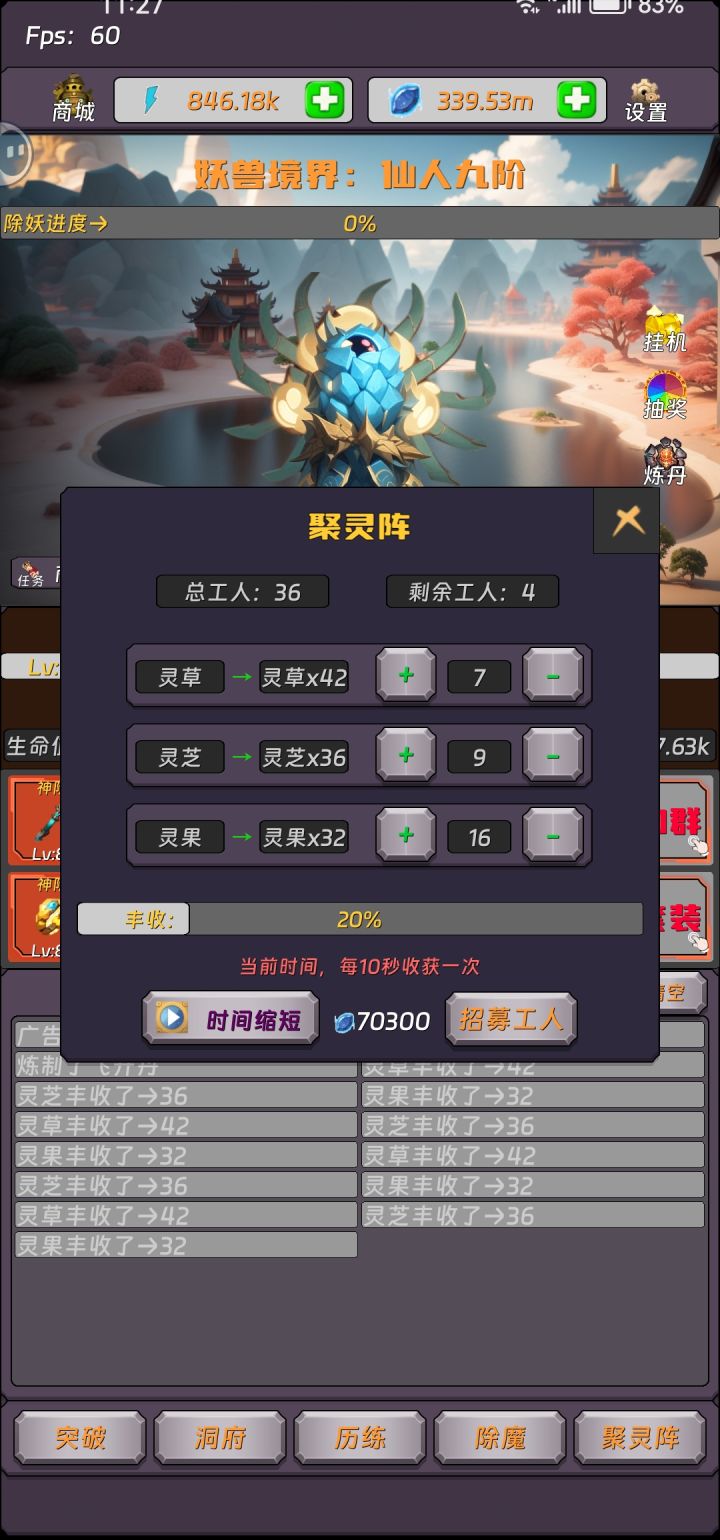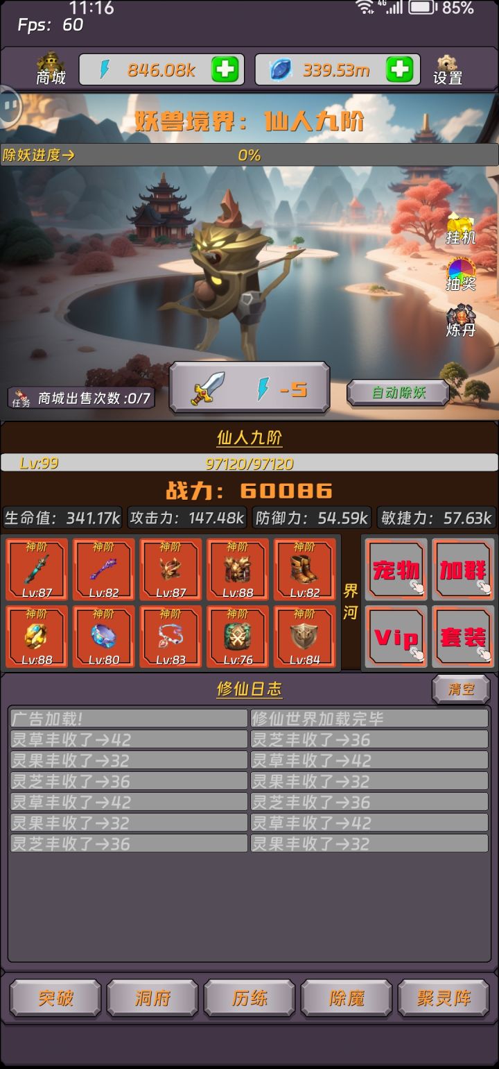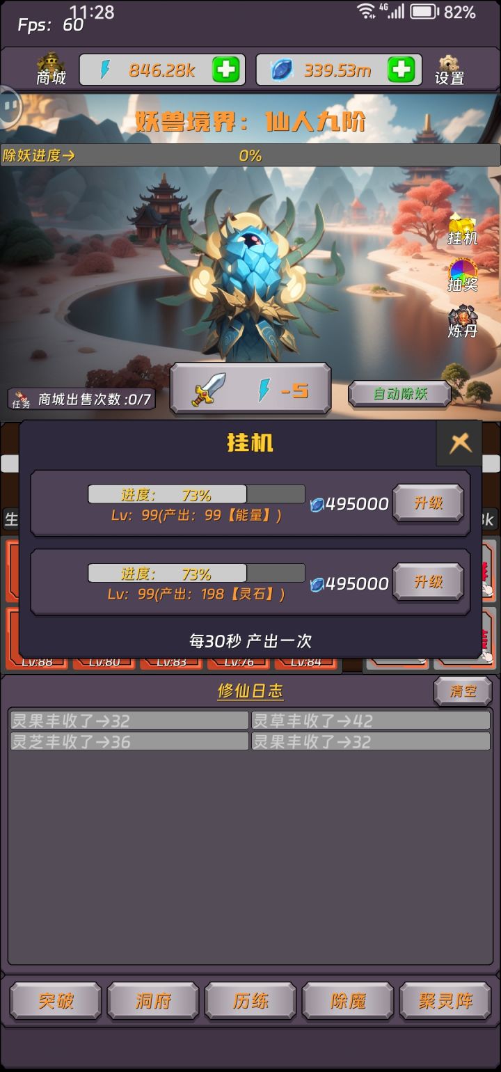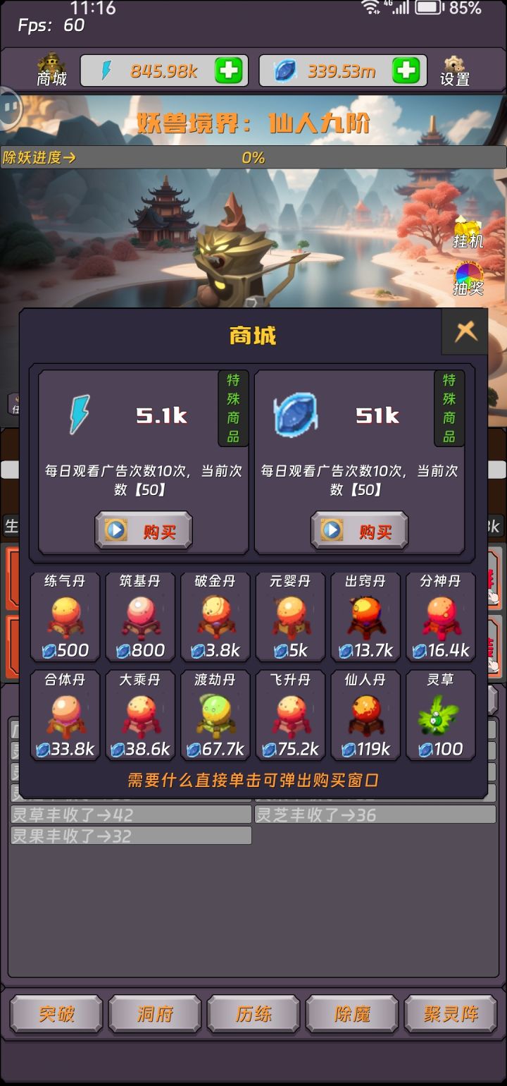 完结撒花了,已经通关了,前期那个历练一定要弄如果是偶尔玩一下子的话就看看广告然后能量用完了,就等明天或者是去历练获取能量,然后前期升级那个挂机加成灵石可以慢慢来因为灵石中期都不会缺少,聚灵阵是可以获取炼丹房里面的材料的时候材料就可以源源不断的有了,所以前期灵石就是买突破丹然后升挂机加成和升级一点聚灵阵获取炼丹材料然后就可以一直炼丹了因为前期还是会有点缺灵石的,如果去用灵石买制作突破丹的材料丹,太坑