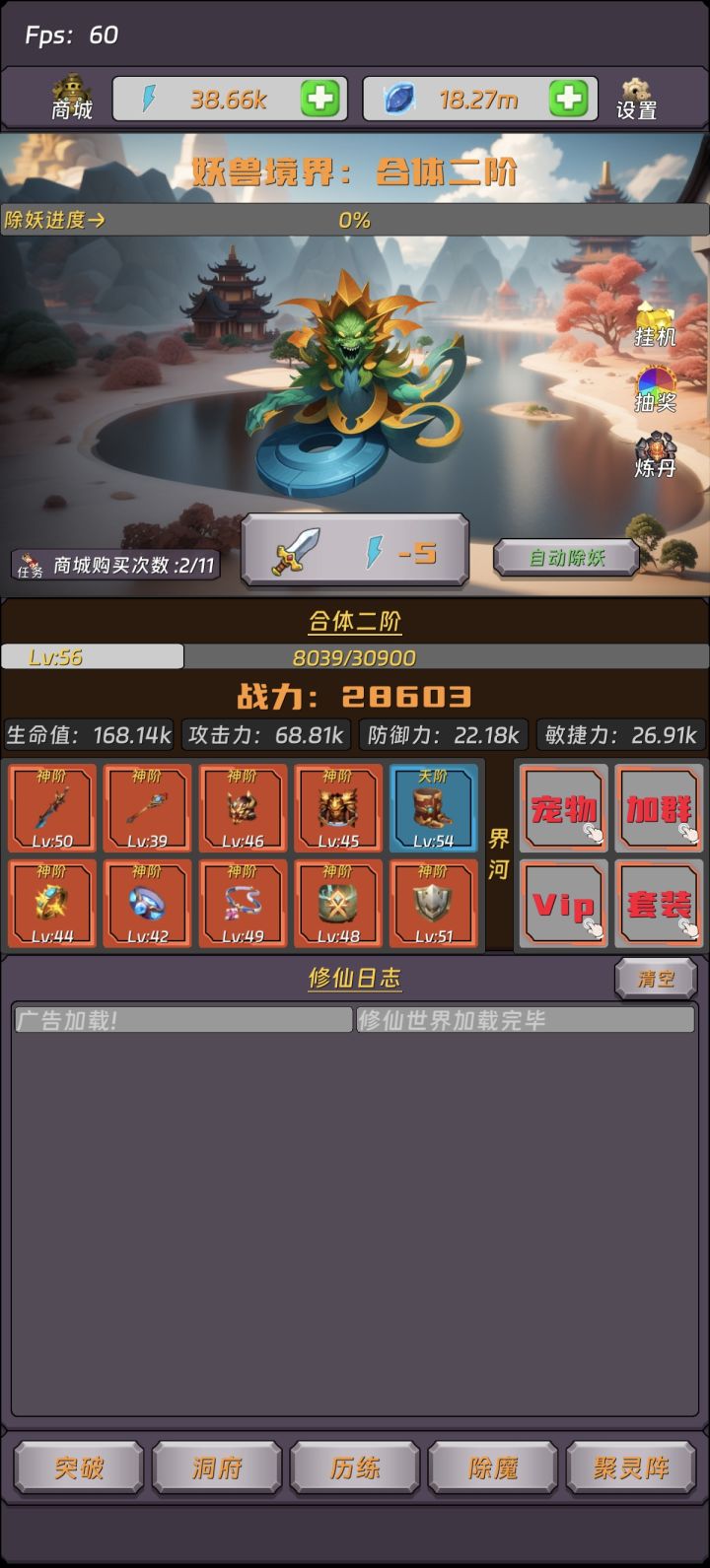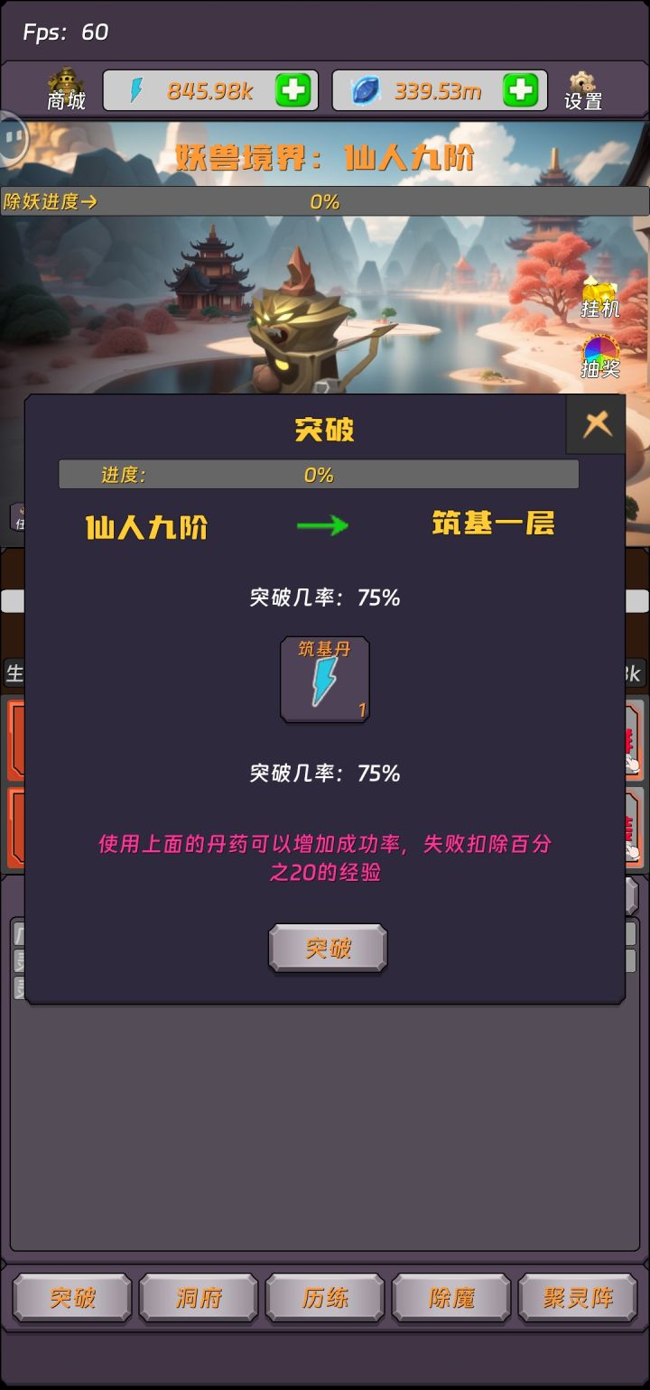 在游戏没上线之前 看到了游戏简介 感觉还可以就预约了 本以为需要等很久才能试玩 没想到很快就上线了 啥也不说了 先去体验一下 进入游戏 有点懵 没有新手指引.....不过不是问题 作为资深玩家 没有指引 自己摸索也没问题 首先 去打个怪试试水 发现 打怪只是有个进度条 完全不用担心打不过 就是进度条 两秒一个怪 好吧 挺简洁...一个怪 固定十点经验 等经验条满了 左下↙去突破 有失败的概率