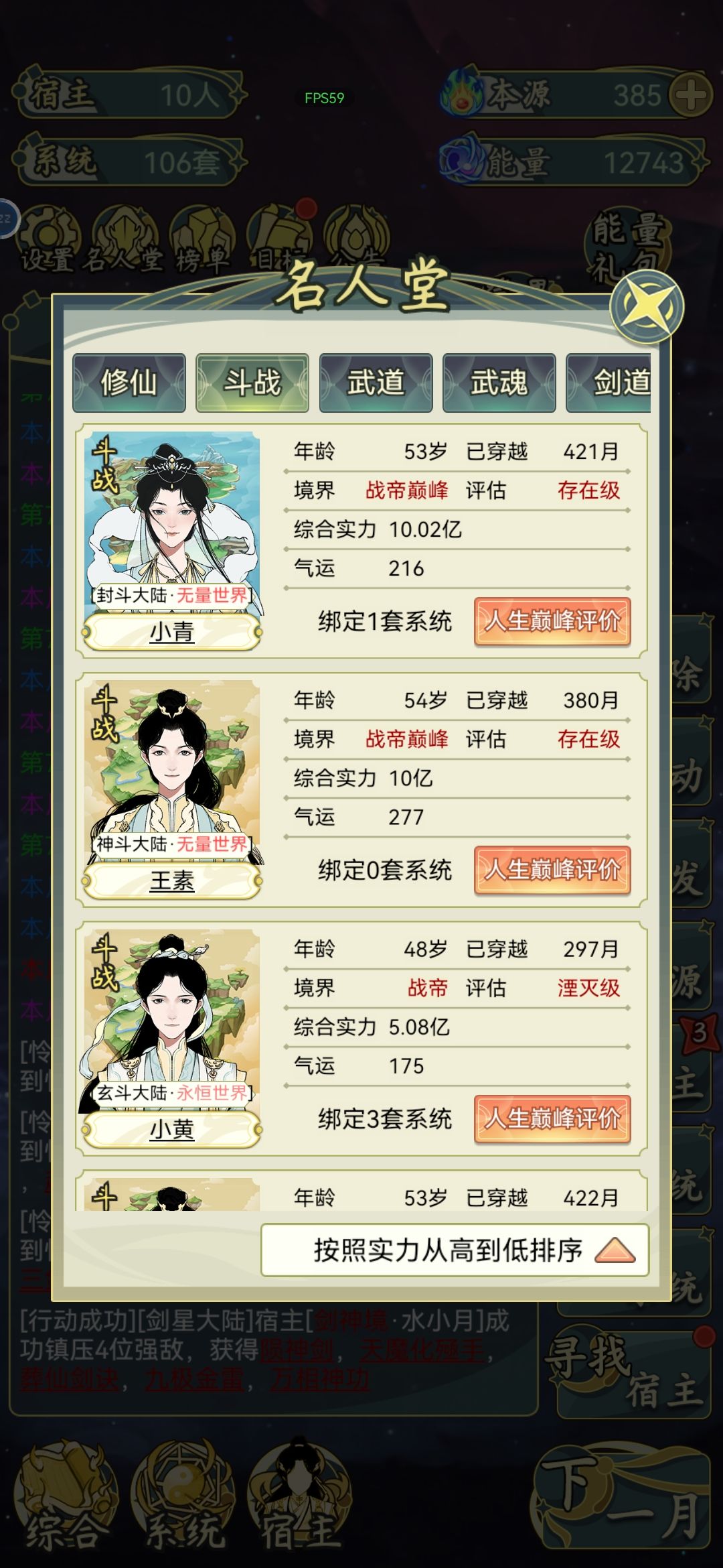 最开始玩建议先弄几个9级红色系统(系统升级需要能量,无脑下个月就行),世界和人物属性不用管,进去以后抽系统,一般6连都会有一个,先搞出一套再考虑完美世界和人物开局,需要注意的世界是武魂和儒道,刷了几百次最高只出过大世界,其他皆为无量最高。 名人堂战力与所属世界大小类型挂钩,大世界5000万,无量10亿,在即将到达战力瓶颈时可把红色系统全下了,不然就只有浪费三个系统