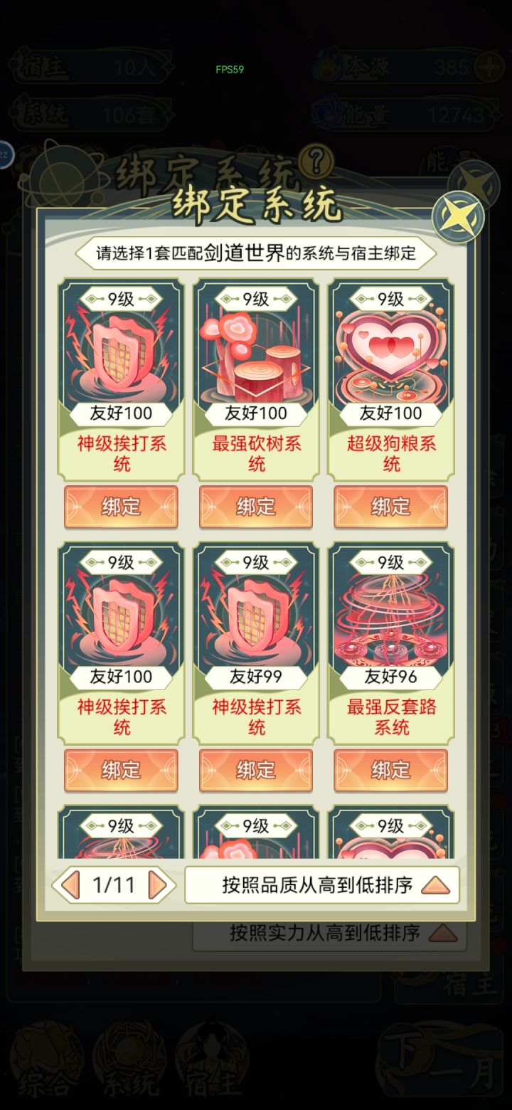 最开始玩建议先弄几个9级红色系统(系统升级需要能量,无脑下个月就行),世界和人物属性不用管,进去以后抽系统,一般6连都会有一个,先搞出一套再考虑完美世界和人物开局,需要注意的世界是武魂和儒道,刷了几百次最高只出过大世界,其他皆为无量最高。 名人堂战力与所属世界大小类型挂钩,大世界5000万,无量10亿,在即将到达战力瓶颈时可把红色系统全下了,不然就只有浪费三个系统