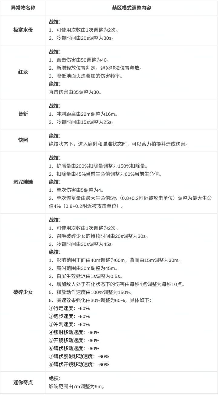 亲爱的超越者们:自5月22日(UTC+8)《七日世界:禁区》模式(以下简称“禁区模式”)以抢先体验形式与大家见面以来,我们持续关注超越者在禁区模式中的异常物战斗体验,基于大量反馈和数据分析,我们进行了本次平衡性调整。平衡性更新本次调整后,我们也将持续关注调整的影响,并评估是否进一步调整。后续我们也将持续优化不同异常物的战斗体验和数值平衡,推出更多全新异常物,为超越者们带来富有乐趣的禁区模式体