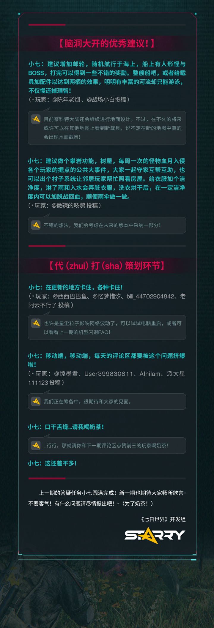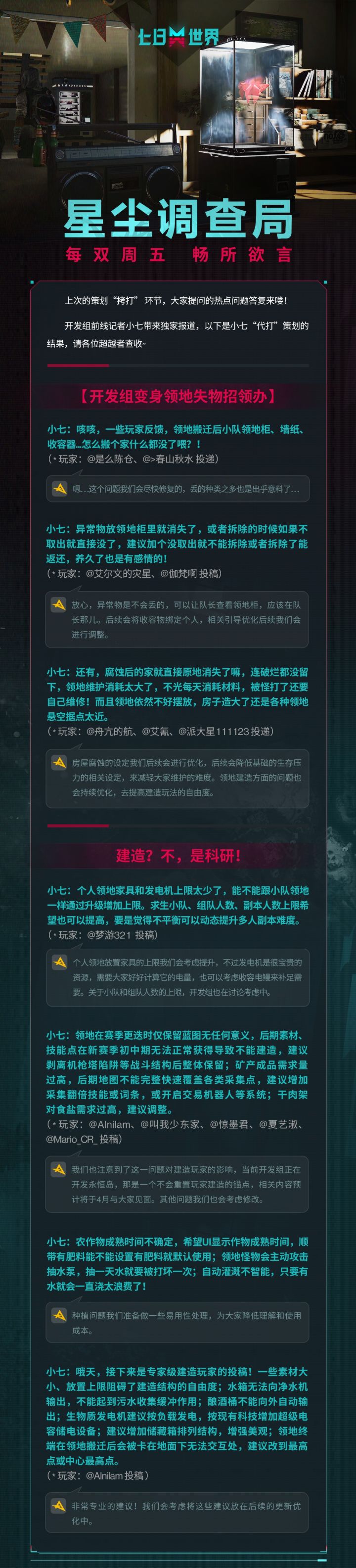 #七日世界##七日世界畅所欲言#【互动有奖】开发组变成“失物招领处?!”、“是建造还是科研?”、“枪械描边一定是策划干的!”小七揣着上期问题的策划答疑来咯,快来看看你关注问题的对应答复吧!同时,新的一期“每双周五 畅所欲言”栏目也开启了!还是老规矩,无论是建议、吐槽、夸奖等等,发在评论区,小七一并收下~为表诚意,评论区点赞数前3的超越者将收到小七送出的【30元奶茶红包*1】,下周一开~