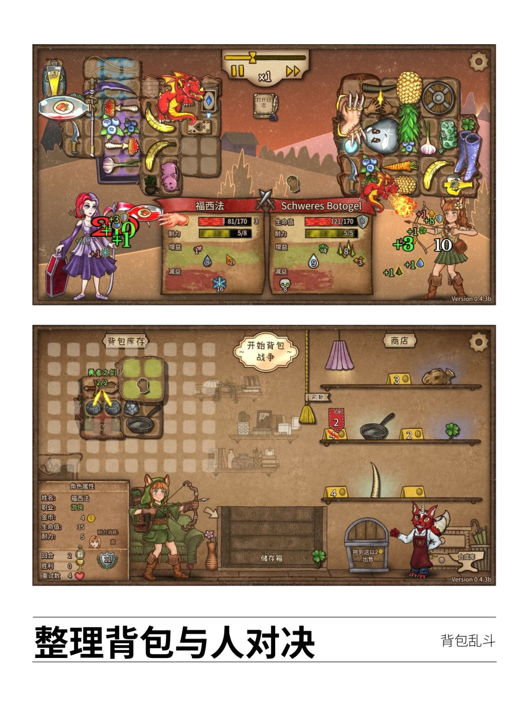 🎮游戏名称:《背包乱斗》/《背包战争》 🖥️游戏平台:Steam(已上线)、Android(可预约) 💪游戏玩法: ①制定你的策略 在《背包乱斗》中,你将使用背包中的物品进行战斗。你的战斗力取决于物品的选择,最重要的是在背包内物品的摆放!摆放得越好,你的战斗力就越强! ②收集&合成物品 物品的大小、形状、价格、稀有度都不同。可以通过组合不同物品获得更加强大的装备。制作强力魔药,合成传奇武器,还能孵
