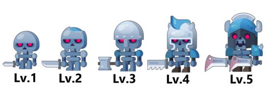 战火已然蔓延在整个地下世界,作为地下世界的老演员大头兵骷髅战士首当其冲要站出来献一份力。 在西方文化中骷髅常常被视为邪恶的代表,分明的骨骼上挂着少许鲜肉,看上去血糊刺啦,怪吓人的。但是魔王物语中每一个魔物都是本性善良的,我们赋予他更呆萌的形象,但作为前排战士,他还是需要一些道具来展示身份。骷髅展示的技能也是简单粗暴,毕竟骷髅没脑子嘛~ 骷髅战士属于单体物理强攻型单位,攻防能力均衡(除了没脑子)