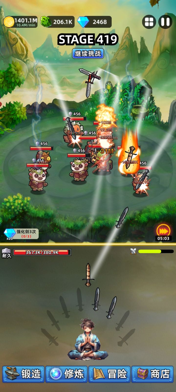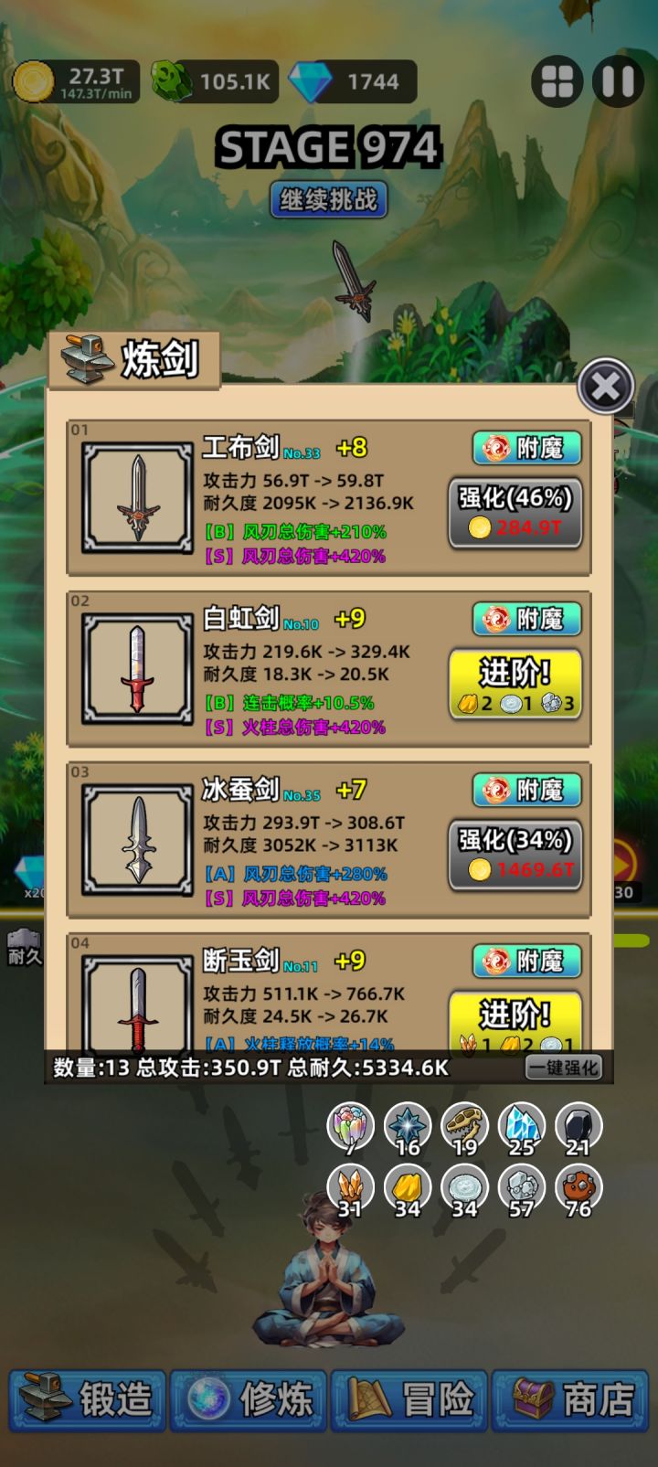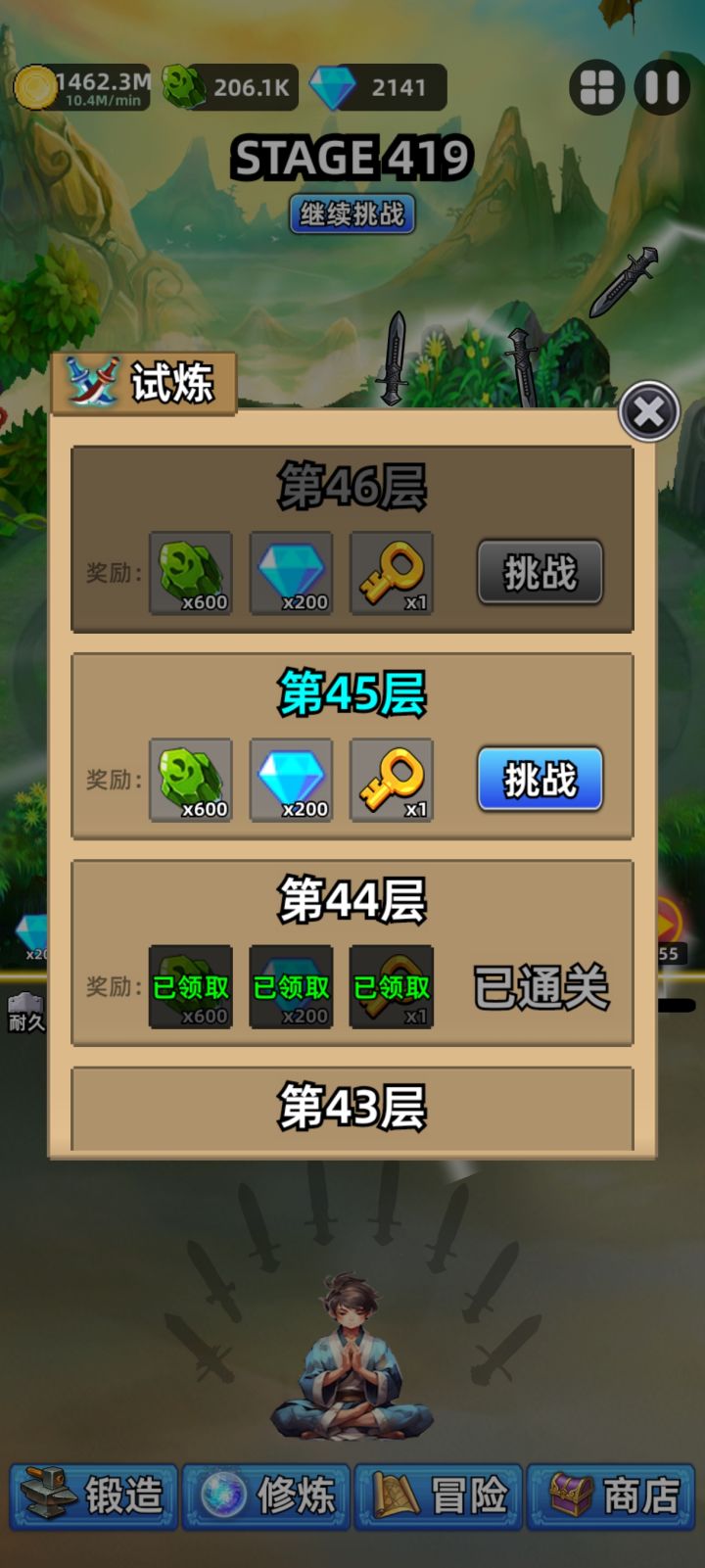 开局: 先手动推图到41层,跟着主线走,没啥难度,有手就行。41层之后就要开始可以看广告和自动打怪了。 (因为是广告类游戏,因此广告必看,不然这游戏简直就是地狱级的。。) 再说锻造: 前期,5把剑,在5级之前随便点,能升就升,所有金币都用来升剑(主要是加快推图进度) 5级之后,所有资源只升一把剑(附魔先不刷,都留着,后续出剑灵了再根据剑灵刷,不然现在刷得都得浪费) 再说采矿: 新手误