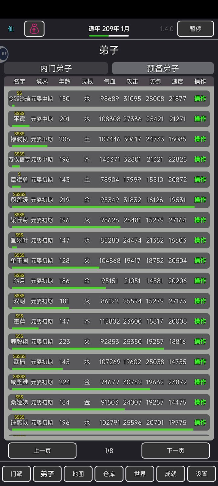 最后,整个模板。弟子修炼到练气中期就去收徒,徒弟练气中期后再收徒,这时候第二代练气中期的徒弟就可以去游历捡垃圾。等第三代徒弟收徒后就让他也去历练,无限循环。 收徒只是能扩大弟子数量并没有啥用,基本弟子培养到练气收徒后他就不配在留在主峰了。可以留一些SSSSS的徒弟让他们一直在泉水修炼。