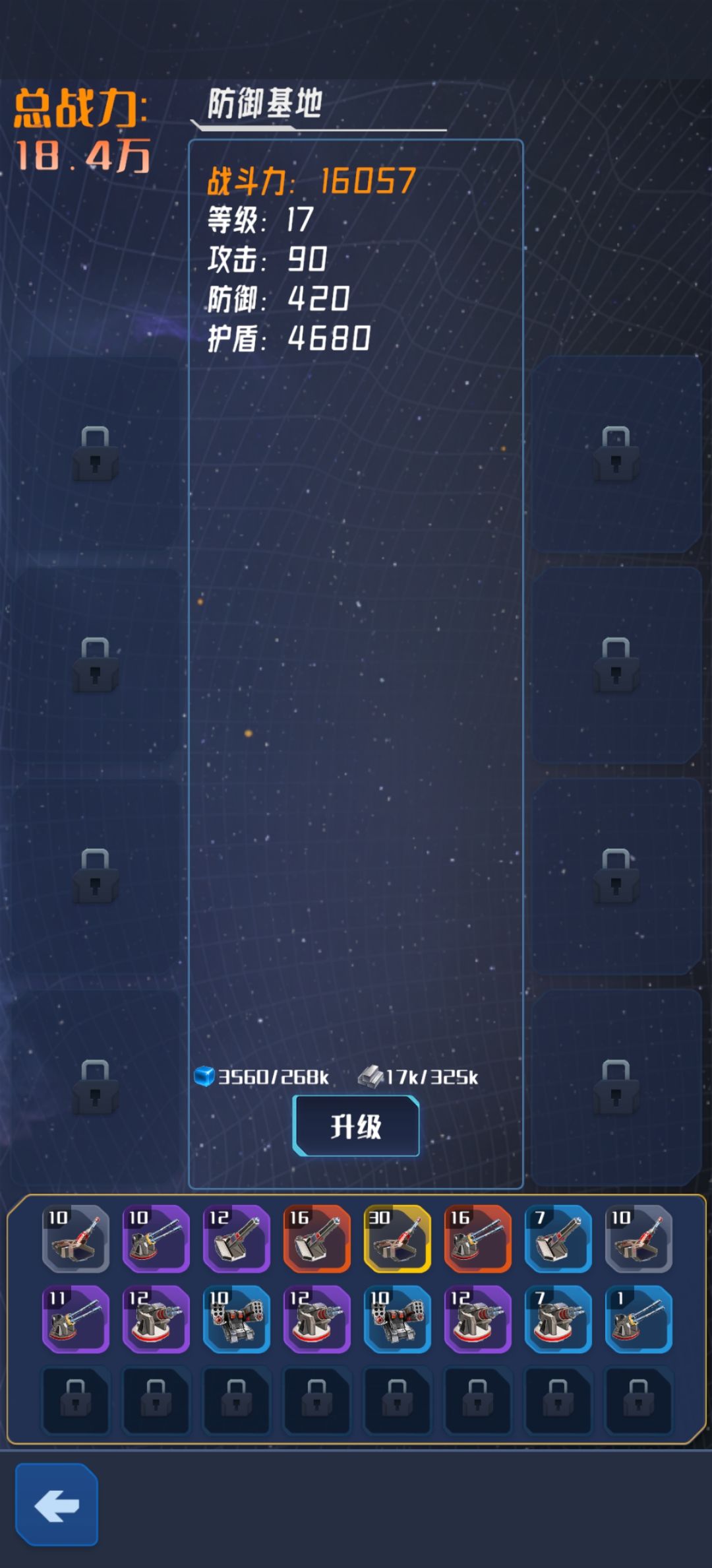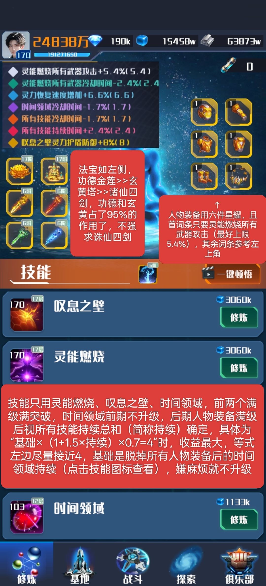 主要决定实际战力的,是阵型,词条和技能三个点 1.技能 技能很简单,灵能燃烧>叹息之壁>时间领域,只用这三个,升级方面,除了时间领域不要升级,其他都升满级,突破方面,三个技能都突破到12层 2.阵型 前期可以用虚空镭射炮和星空密集阵作为主要输出,外加四组减速和破防(反物质动能炮和离子风暴),由于前期阵型我也不是很了解,这里只能给个大概,毕竟是作为过渡,有什么用什么,升级最高70级金色,不要升到