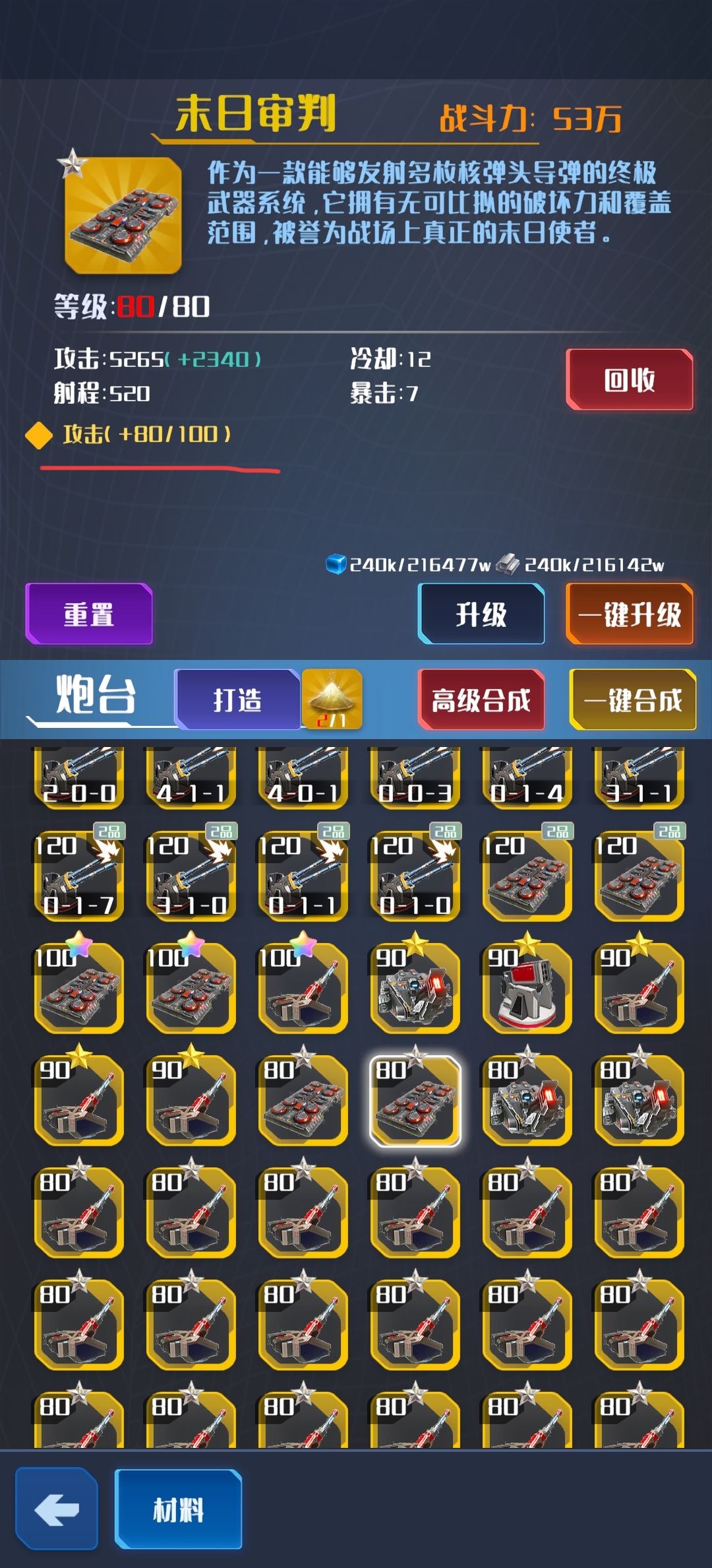 现版本下开了10章地图出了新技能时间领域,并且人物装备可以升级末日,镭射,速射/轨道光束基本是最优方式了 具体运用是基地共24个炮位,末日用8个占16位置,速射/轨道光束8位置 副舰32位置,在第二横排放一个离子风暴破防,一个反物质动能减速,第三横排和第四横排同第二排一样,交错放,一个破防一个减速是一组,其他位置全用镭射 基地装备优先所有冷却,所有攻击,末日攻击,速射/轨道光束攻击,射程,暴击 因